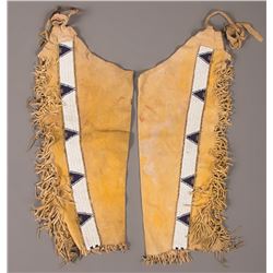 Arapaho Child's Leggings. 23" long inseam. Yellow ochred hide with strips of classic beadwork. Lots of fringe. Circa 1900.