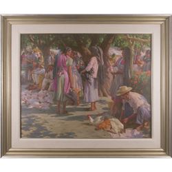 Ned Mueller (1940 - ). Sunday Market Oaxaca. 32" x 40" oil on canvas. Signed lower left. Provenance: Gifted to the Buffalo Bill Center of ...