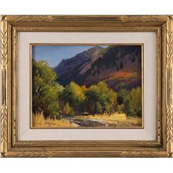 Jim Norton (1953 - ) NWR, CA. Santaquin Canyon. 12" x 16" oil on board. Signed lower left, NWR. Verso: Old Raunig Art Enterprises business...