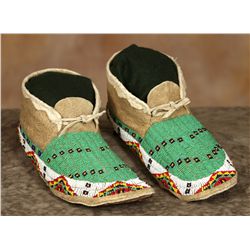 Sioux Moccasins. 11" long. Beaded in typical designs against a desirable green background. Seem to have been collected new and have remained in...