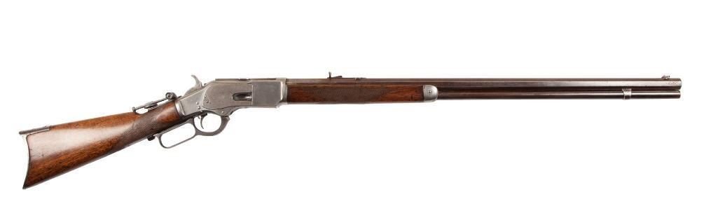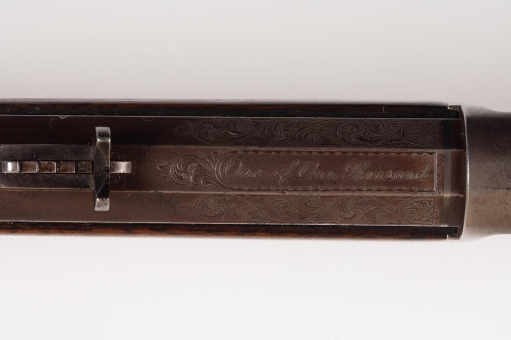 Super rare 1873 rifle. 44-40 caliber. Marked "1 of 1000". 28" barrel with checkered stock and thumb print dust cover. Touch of engraving on end of barrel. Side plate and receiver marked "108" which is correct on 1 of 1000 guns. Factory letter confirms this configuration. Pictured in two Winchester books, The Golden Age of American Gunmaking and R.L. Wilson's book The Winchester 1 of 1000. Serial #31269. Factory letter included.