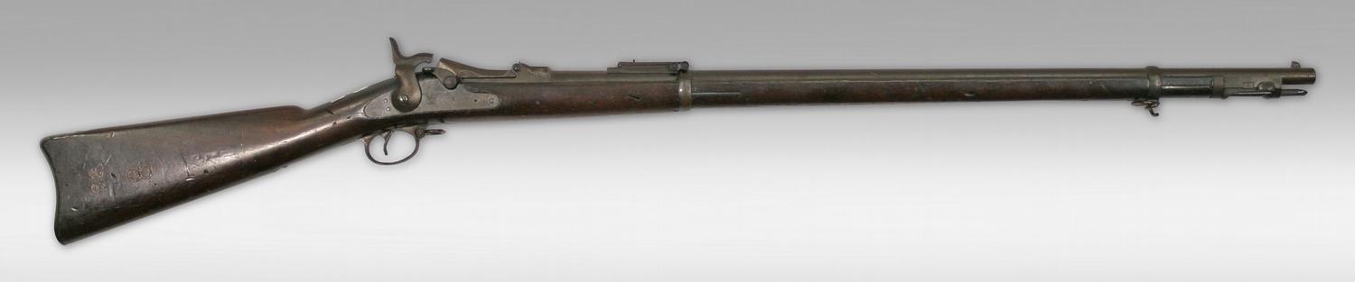 1888 Trapdoor Rifle. 45-70 caliber. 52" long. shows use but no abuse. (est $1,000-1,500) Condition Report: Metal shows little original finish. Wood shows scratches, but is sound. 1891 Cartouche. Metal shows little original finish. Bore is excellent.