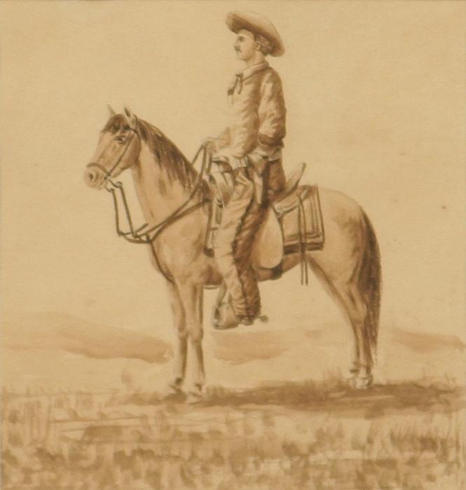 Unknown Artist. Buckaroo. 6 ¾" x 6 ¾" watercolor. unsigned. 19th century. (est $400-500) Condition Report: Paper slightly discolored from age. In new frame