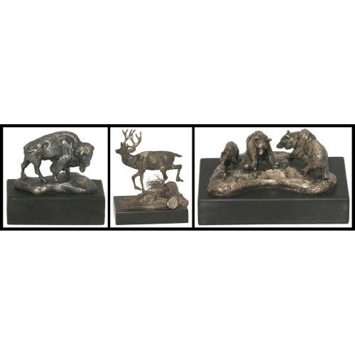 Charles M. Russell (1864-1926) 3 Trigg Silver Bronze Sculptures. (1) Buffalo, 3" high, on 1" marble base, #36/100. (2) Mule Deer, 5 1/2" high, on 1" marble base, #36/100. (3) Bears, 4" high, on 1" marble base, #36/100.