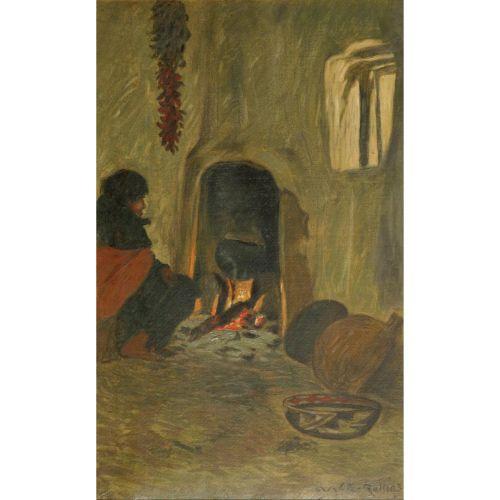 Warren E. Rollins (1861-1962) Pueblo Firelight, 22" x 14" oil on canvas, signed LR