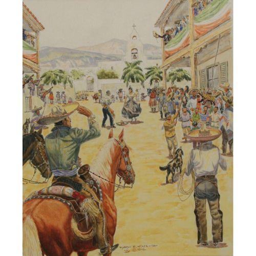 Byron Wolfe (1904-1973) CAA, Holiday at the Hacienda, 14 1/4" x 12" watercolor, signed LC, dated 1972