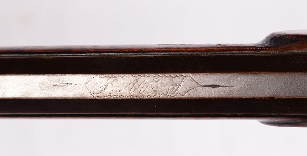 37” octagon barrel. Stamp is illegible, decorated with an etched bird scene.