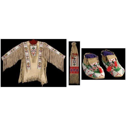 Sioux Beaded War Shirt, Moccasins and Pipe Bag. All sinew sewn, Classic form, Excellent condition. (1) Beaded War Shirt, 32" long, 3" beaded panels on shoulders, front and back. (2) Beaded Moccasins, 11" long. (3) Beaded and quilled pipe bag, 37" long including fringe, c. 1910. Provenance: Pine Ridge Sioux Indian Harold Conroy, Elizabeth Weaver, Blackpipe State Bank Collection
