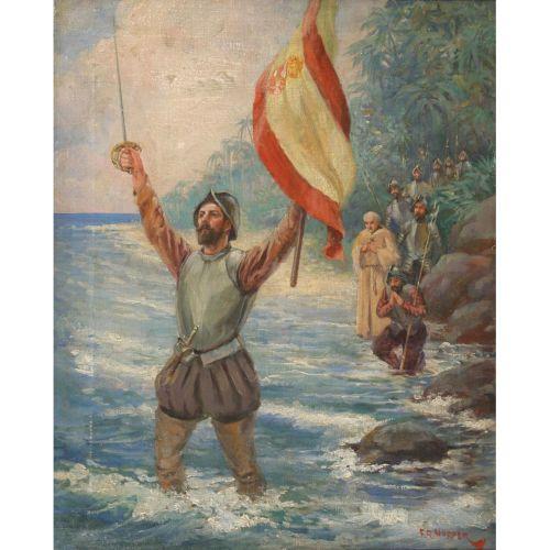 F.R. Harper (1876-1948) Balboa Discovering the Pacific, 22 1/2" x 18" oil on canvas, signed LR