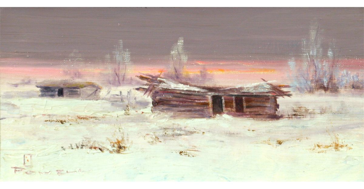 Ace Powell (1912 - 1978). Winter Ranch. 6" x 12" oil on canvas. Signed lower left: [ace card] POWELL. Condition reports can be viewed at www.marchinmontana.com/docs/2013CR.pdf