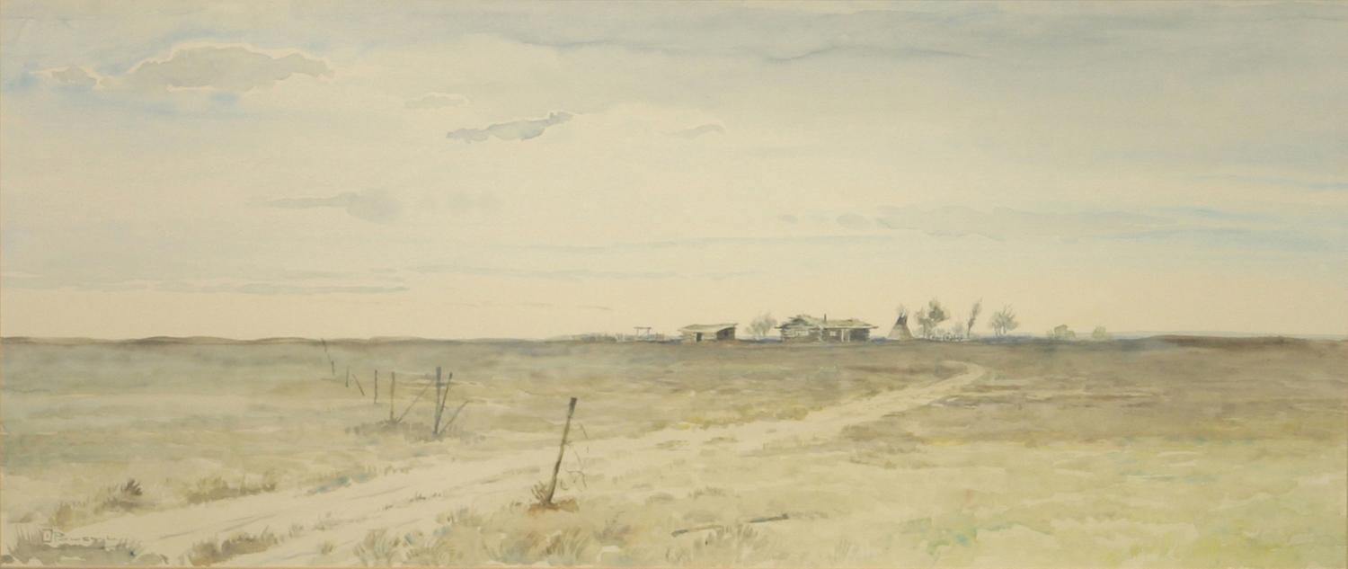 Ace Powell (1912-1978). Homestead. 14 ¾" x 34 ½" watercolor. signed lower left. (est $1,500-2,500). . Provenance: Estate of Paul & Doris Masa, Kalispell, MT. Condition Report: Crisp and clean and nicely framed