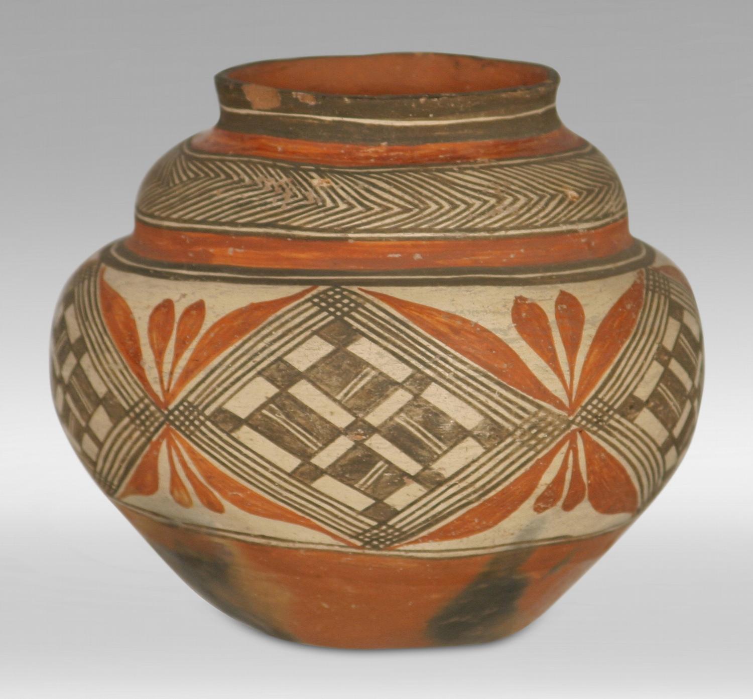 Two Pueblo Pots. (1) Acoma Pot. 7" tall. Multicolored designs on red slip. 1920s, good condition. (2) San Juan Pueblo Wedding Vase. 10" tall. Two toned. 1960s, fine condition. (est $700-900) Condition Report: (1) Minor scratches and scrapes due to use. Minor chipping at mouth. (2) Minor scratches and scrapes but generally excellent