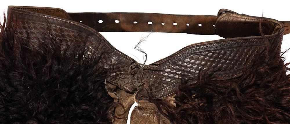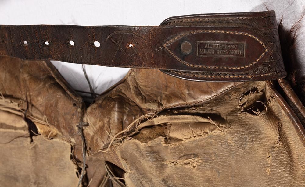 33" long x 36-40" waist. Marked Al Furstnow, Miles City, MT on tooled belt. Late 19th/early 20th century.