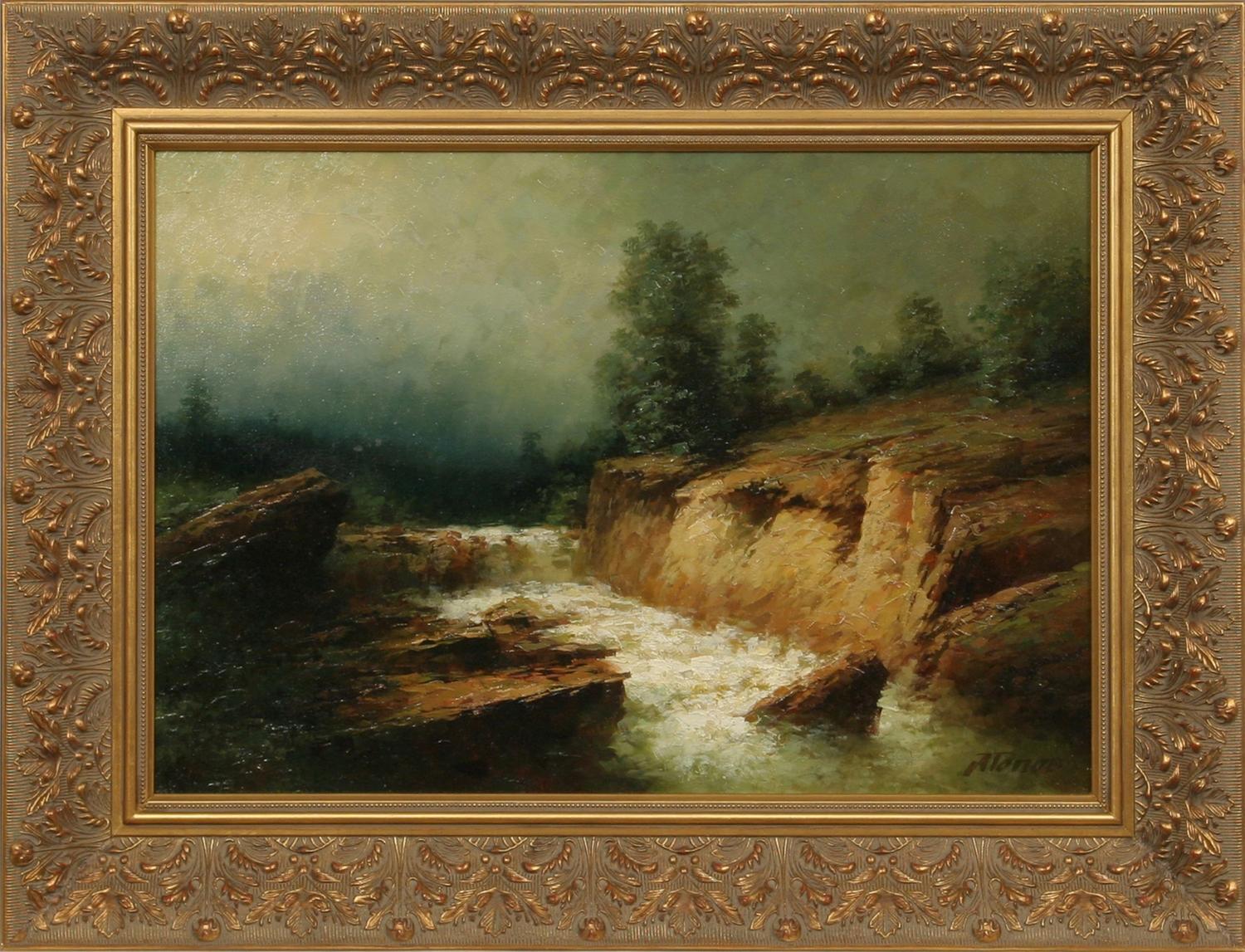 Alexander Nicholayevich Popoff (b. 1959). Winter Cascade in the Wilderness. 13 ½" x 19 ½" oil on canvas. signed lower right. (est $2,500-3,500) Condition Report: Black lights clean