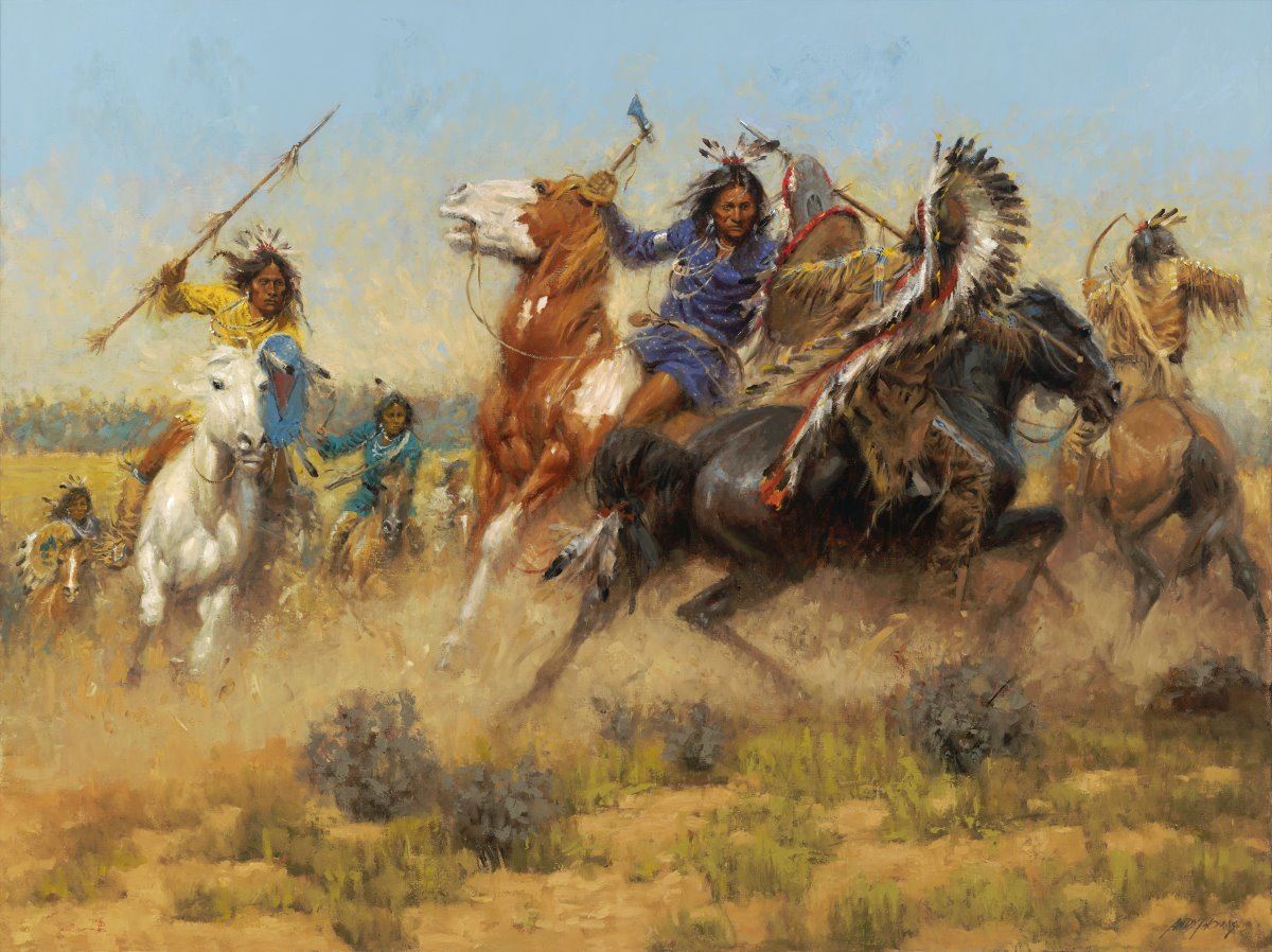 Andy Thomas (1957 - ). Battle of Wolf Creek. 30" x 40" oil on linen. Signed lower right. Provenance: "In June of 1838, Cheyenne and Arapaho tribes attacked a camp of Comanche, Kiowa and Apache peoples. Gray Wolf, who was the Cheyenne leader, said '"I will not give the people a chance to get a smarter man to guide them."' Wearing a full bonnet/headdress, he led the charge into the enemy group but was quickly engulfed by a group of Kiowa and Comanche braves. This painting depicts that moment." -Andy Thomas, January 2016.