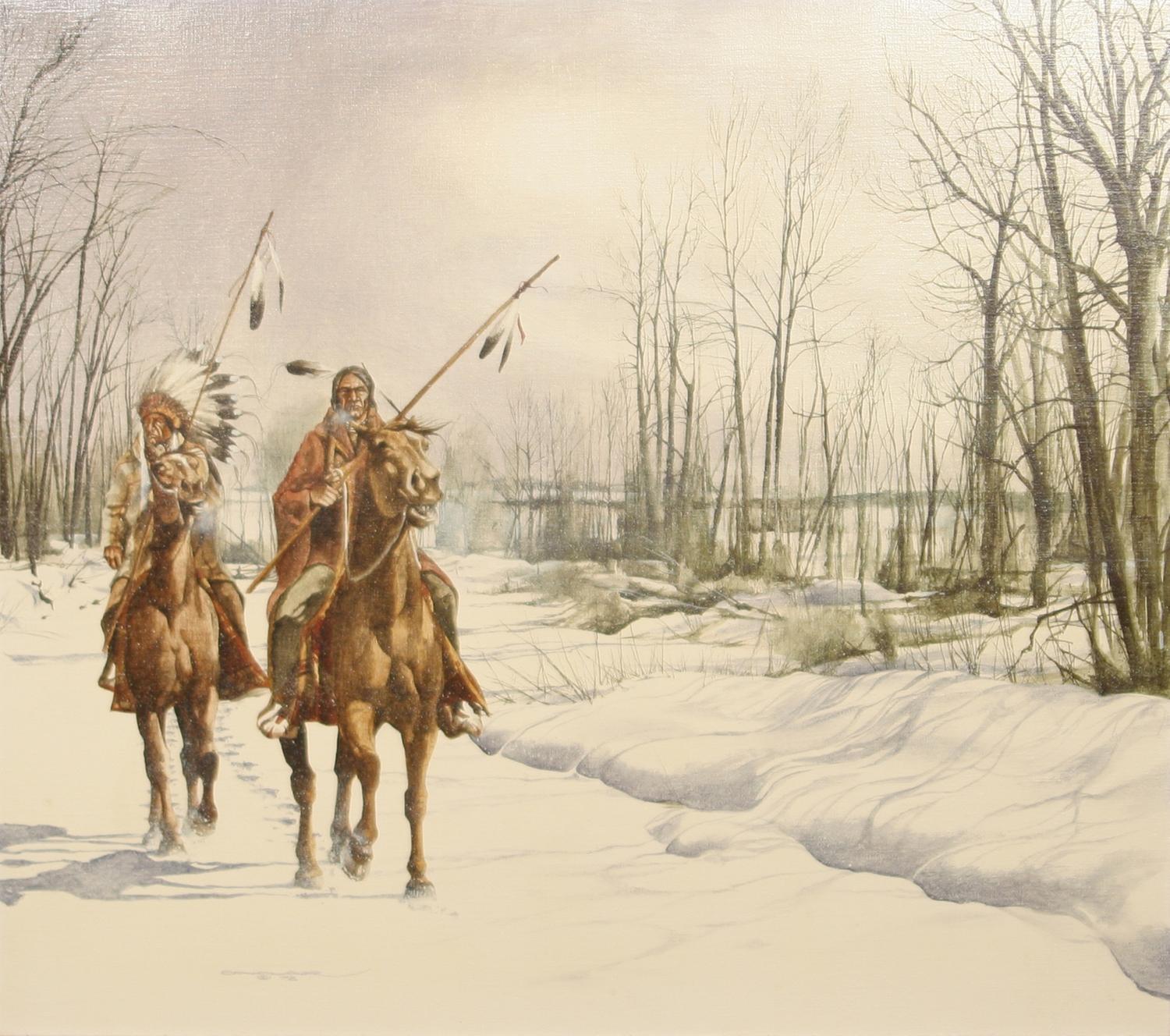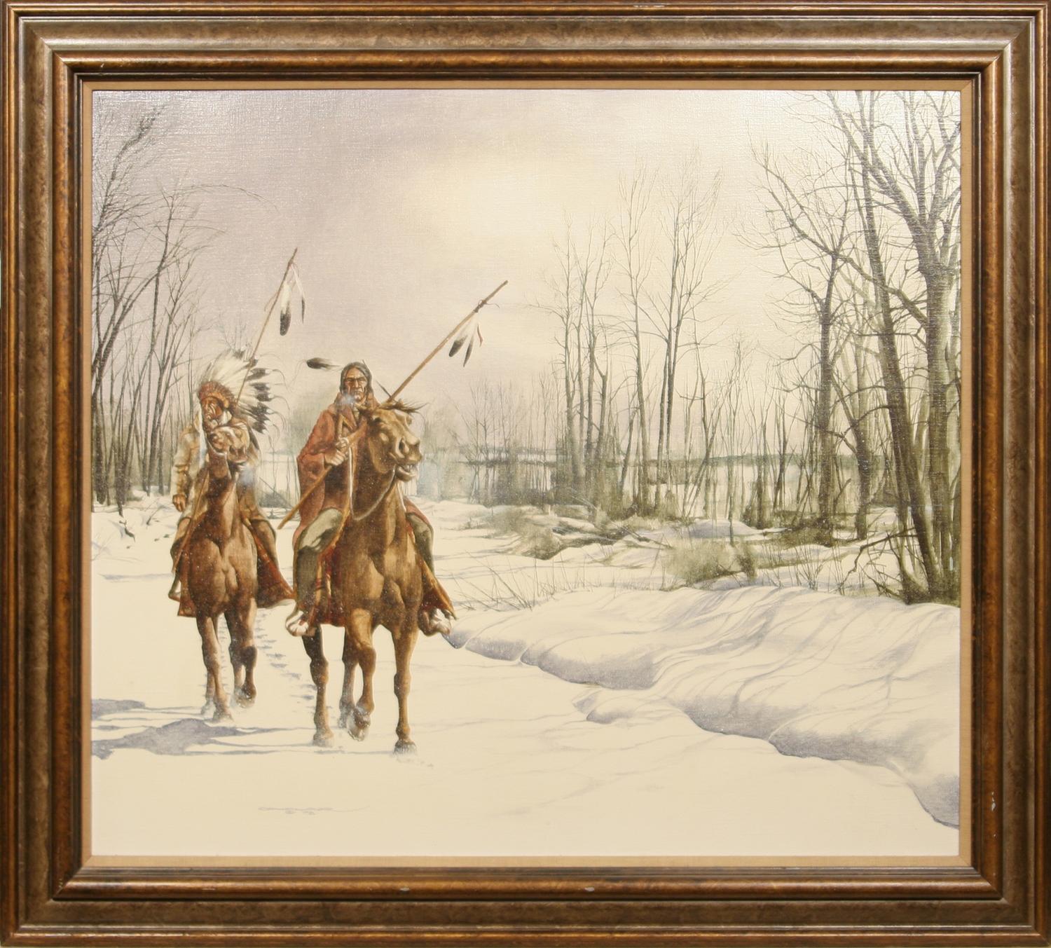 Anthony Sinclair (b. 1943). Moving Quietly On The Snow. 30" x 34" oil on canvas. Signed lower center left. (est $1,000-$2,000) Condition Report: Black lights clean. Frame shows minor scratches