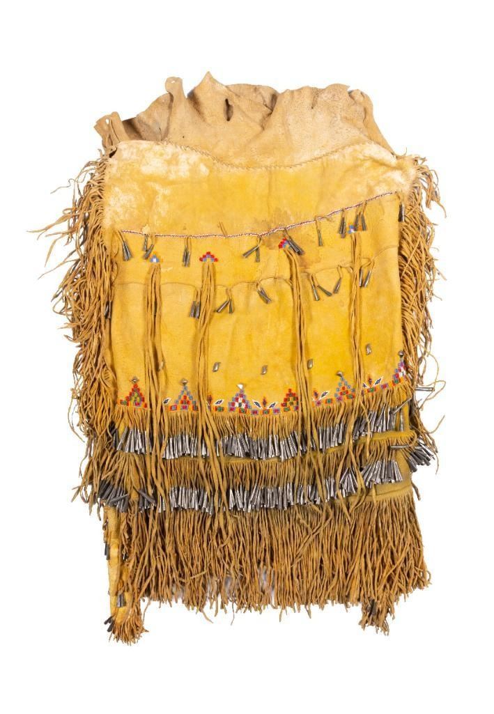 32" fabulous skirt featuring great beadwork, accented with tin cones and fringe all on yellow ochred hide. Circa 1920.