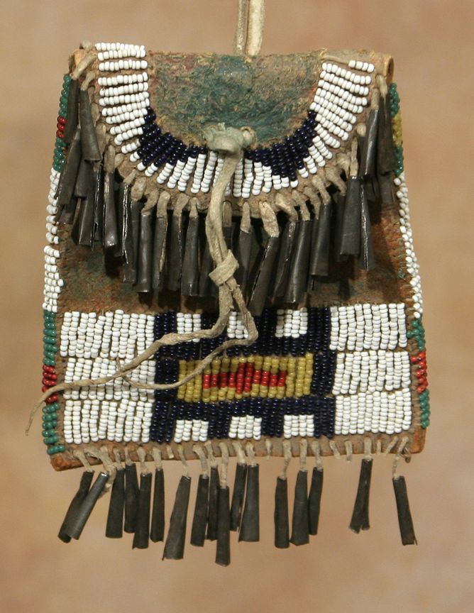 Arapaho Strike-A-Lite Bag. 4.5" x 4" beaded on green ochred, repurposed leather with tin cone accents along the bottom & flap. Circa 1880s. Condition reports can be viewed at www.marchinmontana.com/docs/2013CR.pdf