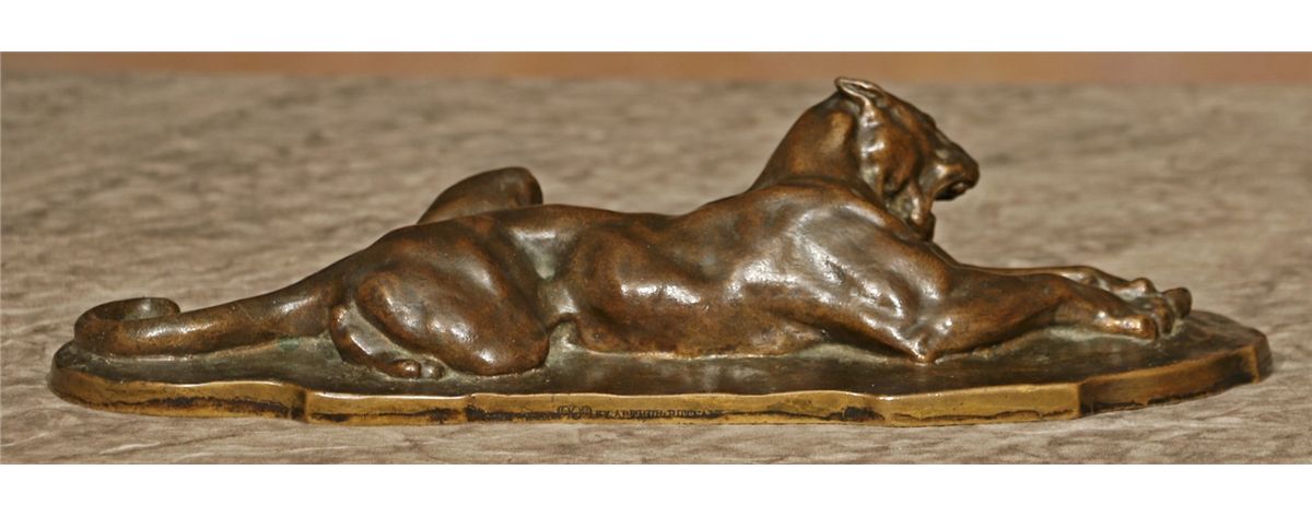 Arthur Putnam (1873 - 1930). Snarling Jaguar. 3.5" x 12.5" x 4" bronze. Inscribed: A PUTNAM. Stamped on underside of base: PUTNAM and STOREY.