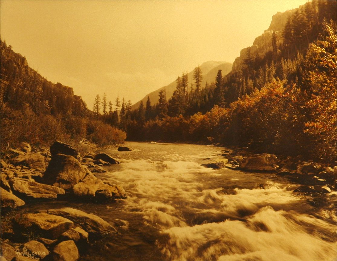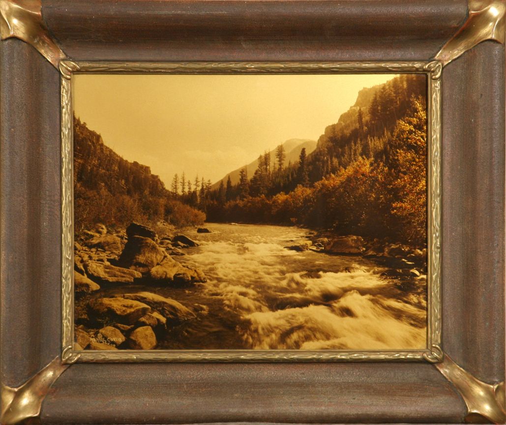 Asahel Curtis (1874 – 1941). The Gallatin River. 10.5" x 13.5" orotone. Signed lower left: © ASAHEL CURTIS 36208. Original frame. Asahel is the younger brother of Edward Sheriff Curtis. Condition reports can be viewed at www.marchinmontana.com/docs/2013CR.pdf