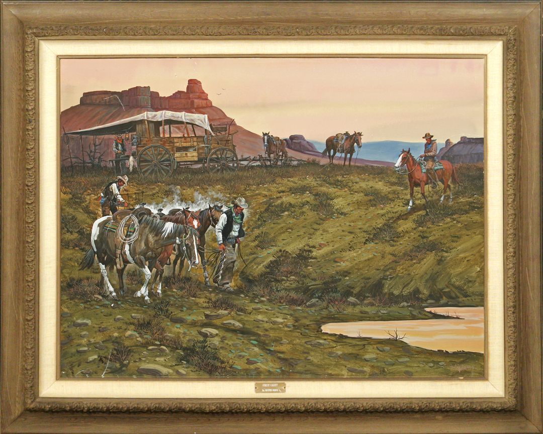 Austin Deuel (1939 - ). First Light. 30" x 40" gouache. Signed lower right: Austin Deuel. Condition reports can be viewed at www.marchinmontana.com/docs/2013CR.pdf