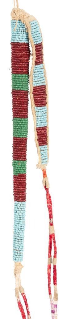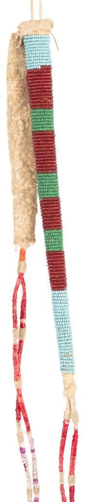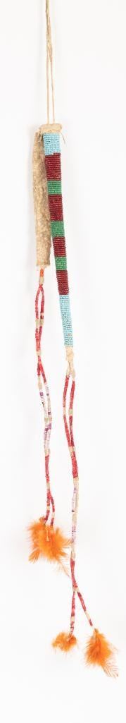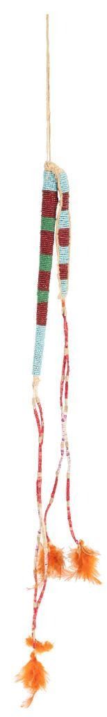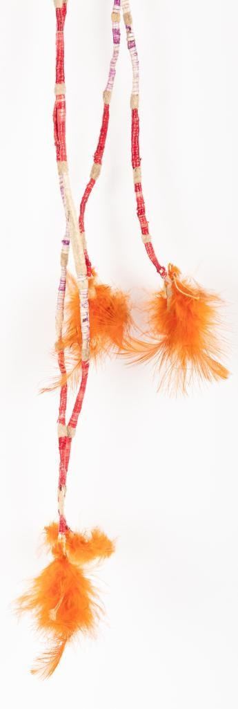 22" overall including quilled drops terminating in orange chicken feathers. Nicely beaded.
