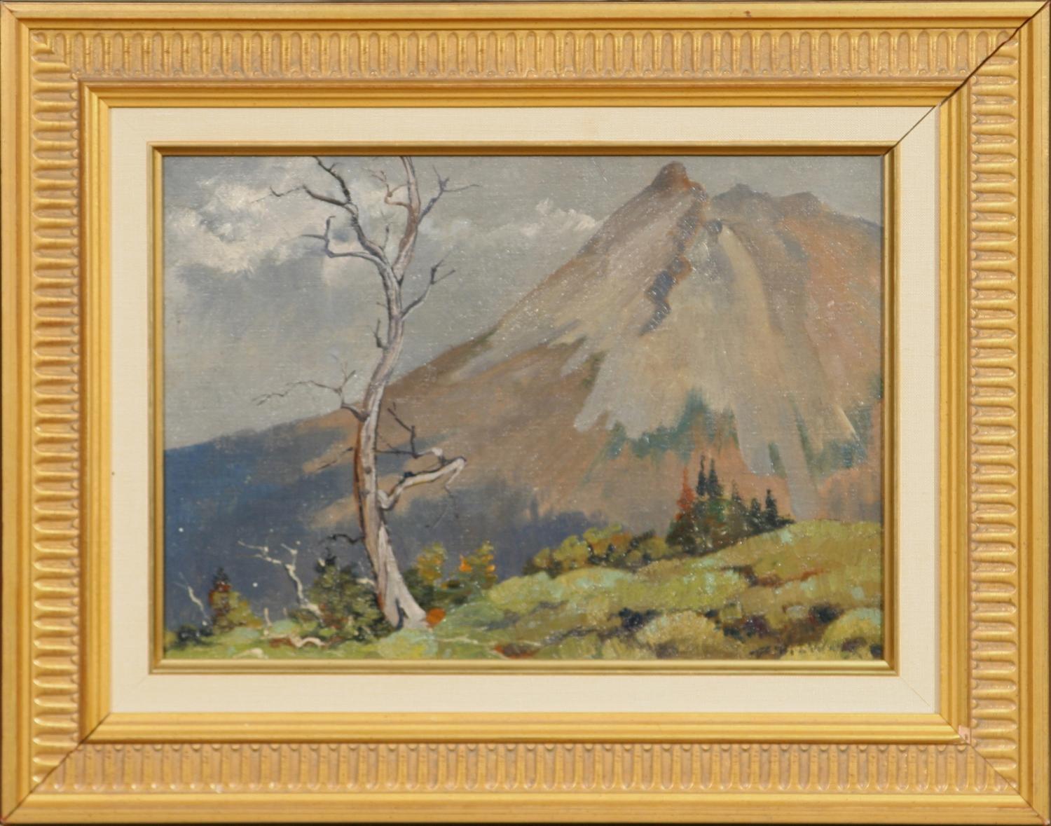 Belmore Browne (1880-1954). Storm Beyond Skoki Mountain. 10" x 13 ½" oil on board. signed lower right. (est $2,000-3,000) Condition Report: Black lights clean