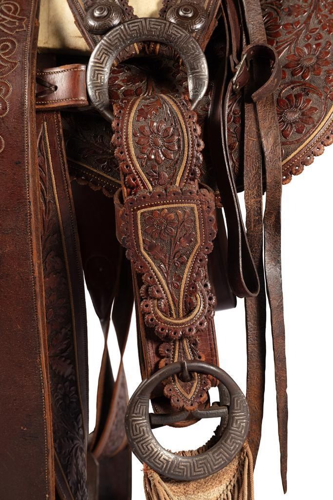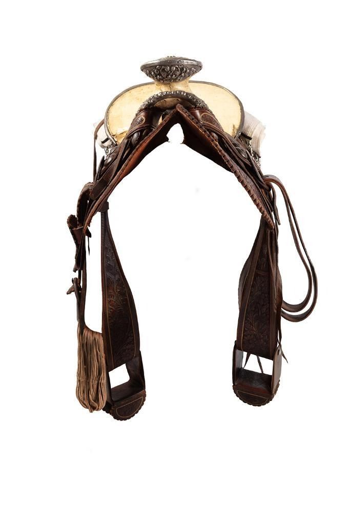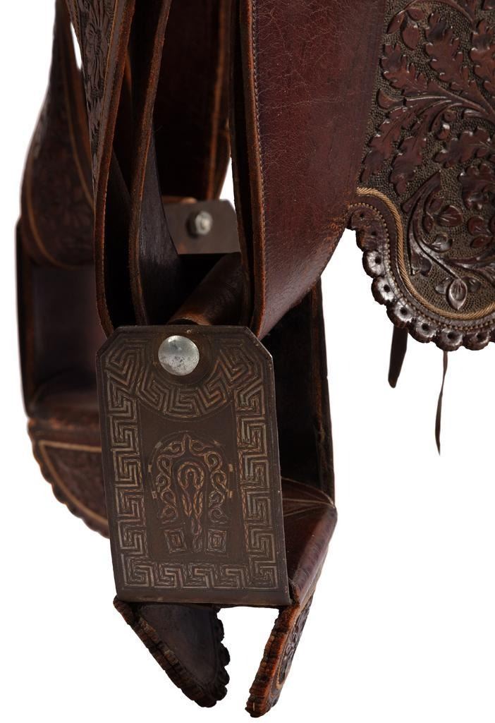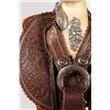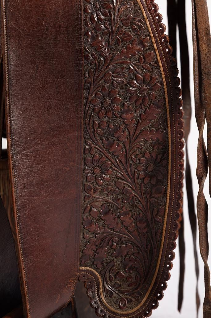 14" seat. Nicely tooled brown leather. Floral designs and a scalloped border all around. Period saddle blanket included.