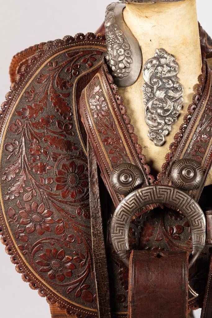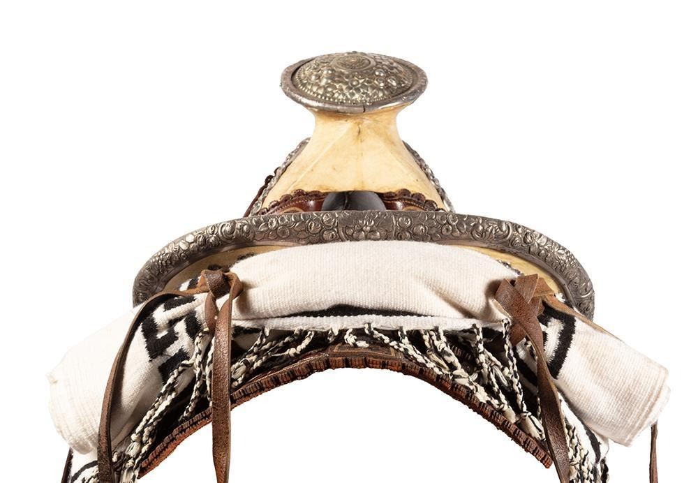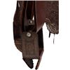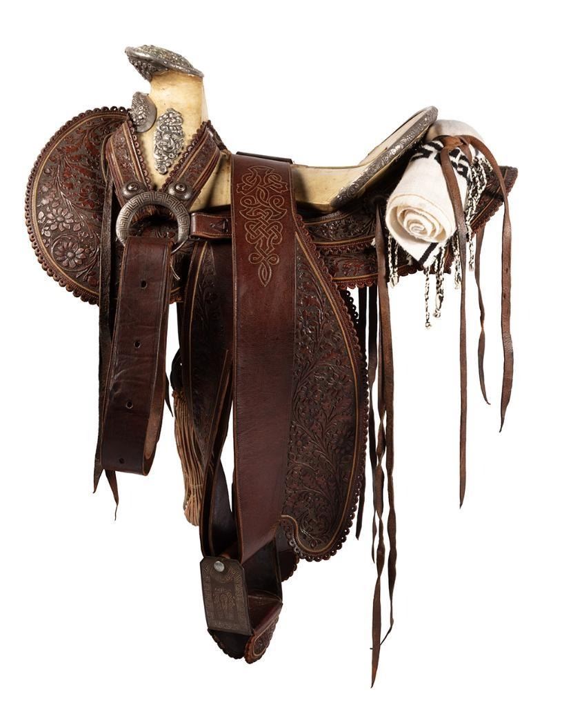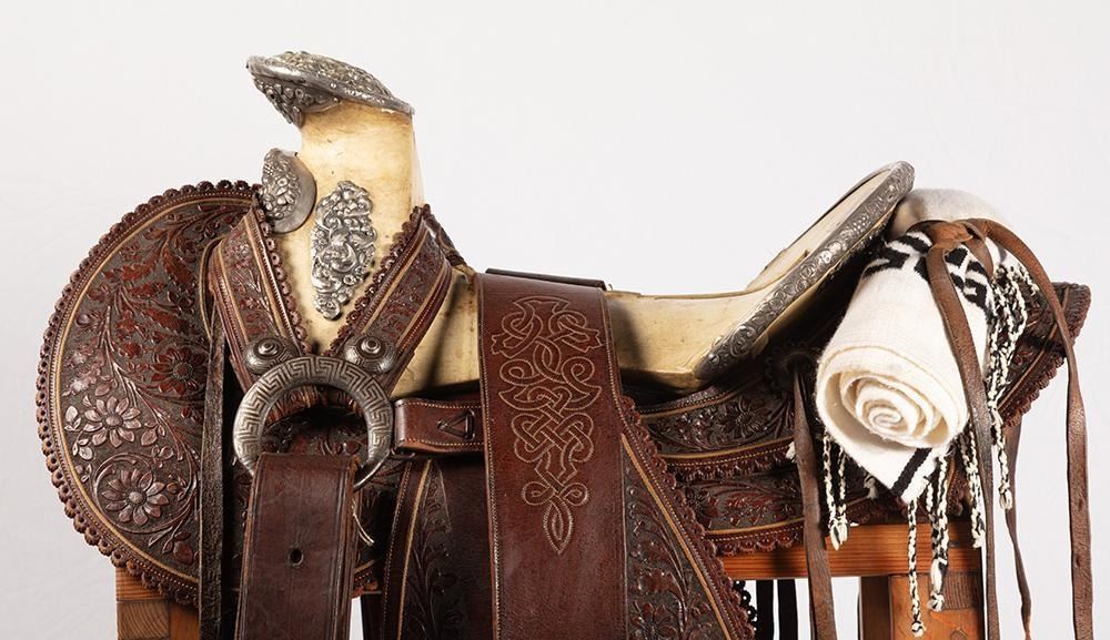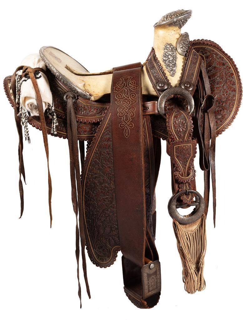 14" seat. Nicely tooled brown leather. Floral designs and a scalloped border all around. Period saddle blanket included.