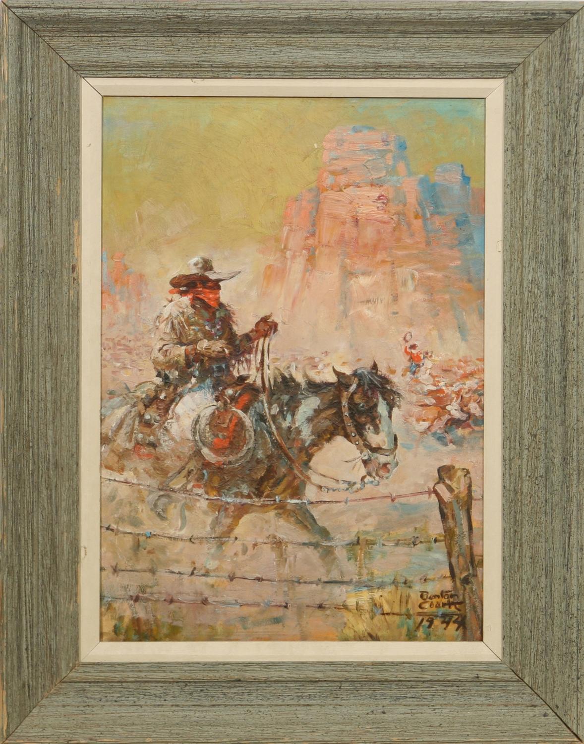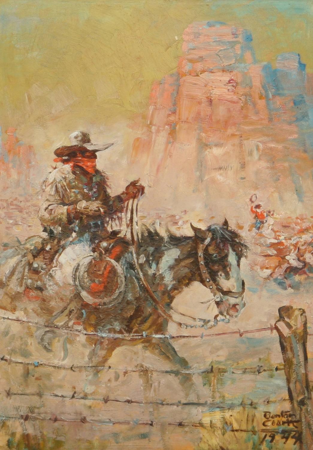 Benton Clark (1895-1964). Roundup. 20" x 13 ½" oil on board. signed & dated 1944 lower right. (est $2,000-3,000) Condition Report: Black lights clean