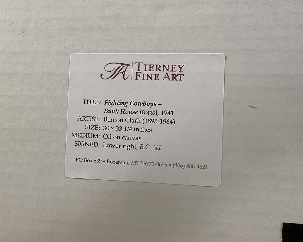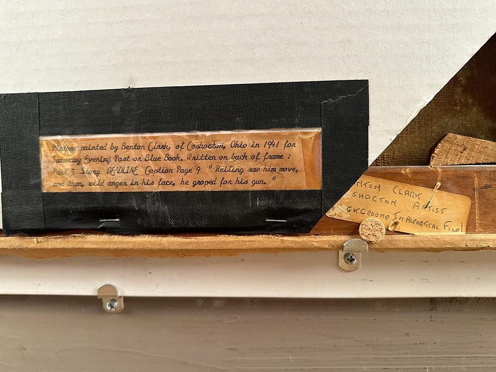 Verso: Old Tierney Fine Art sticker, Bozeman, MT. Card stating: "Picture painted by Benton Clark of Coshocton, Ohio in 1941 for Saturday Evening Post on Blue Book. Written on back of frame: Part 5 Story DEADLINE Caption Page 9 "'Reiling saw him move and then, wild anger in his face, he groped for his gun.'"
