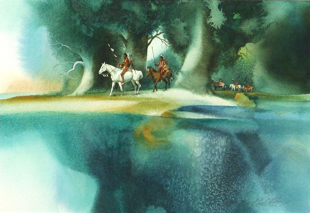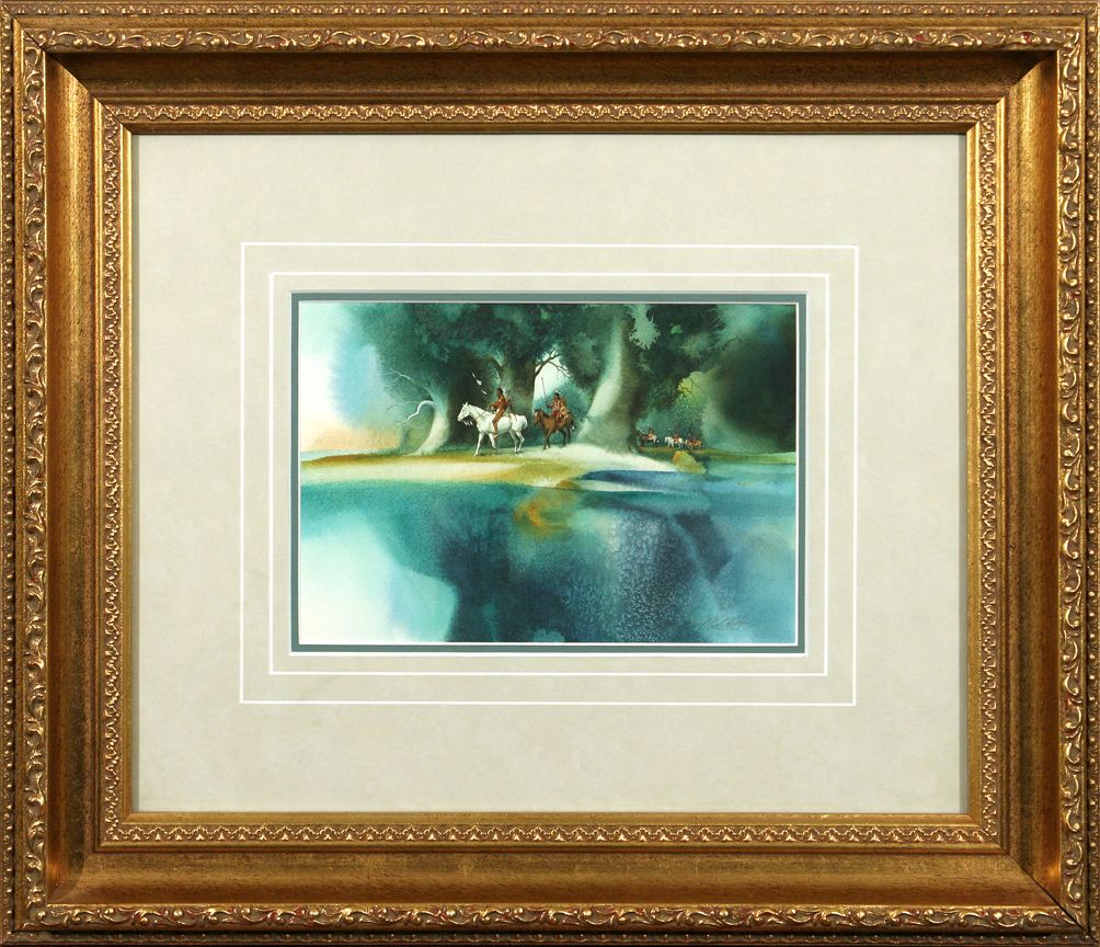 Bev Doolittle (1947 - ). River's Edge. 7" x 10" watercolor. Signed lower right: Jay & Bev Doolittle. Condition reports can be viewed at www.marchinmontana.com/docs/2013CR.pdf