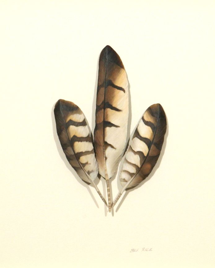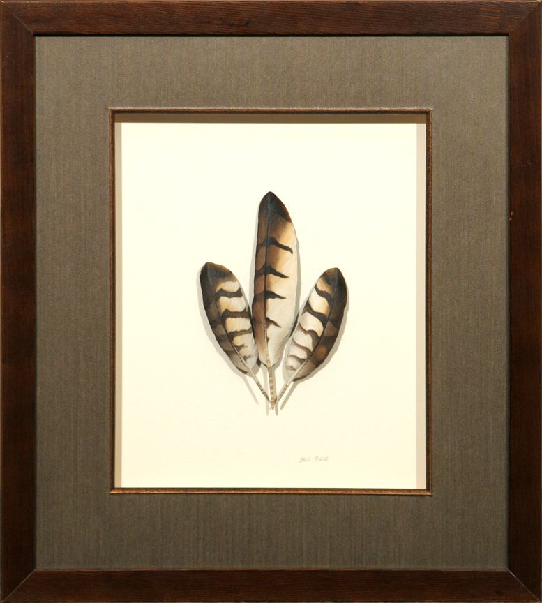 Bill J. Rice (1952 - ). Sharp-Shin Hawk Feathers. 8" & 4.75" feathers carved from basswood & finished in oil paint. Shadow box framed, signed lower right: BILL RICE. Condition reports can be viewed at www.marchinmontana.com/docs/2013CR.pdf