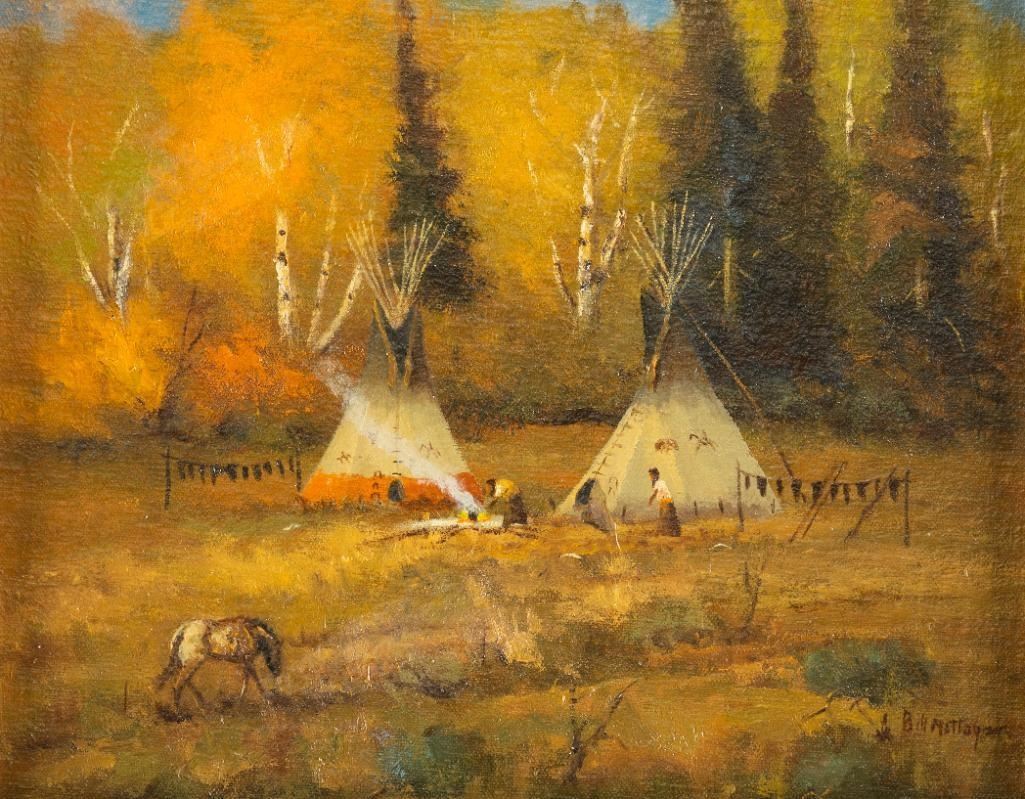 Bill Mittag (1935 - ) Camp of Falling Leaves 11" x 14" oil on canvasboard Signed lower right Verso: Signed. $600-900 Provenance: Private Collection, Conner, MT.