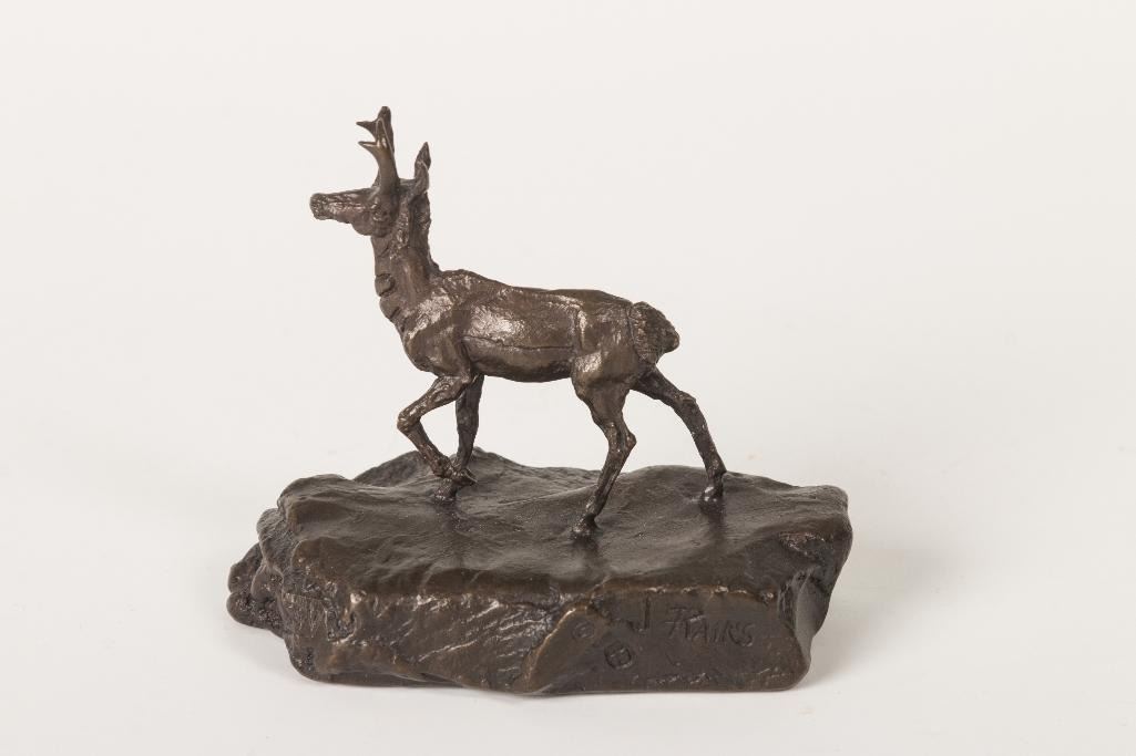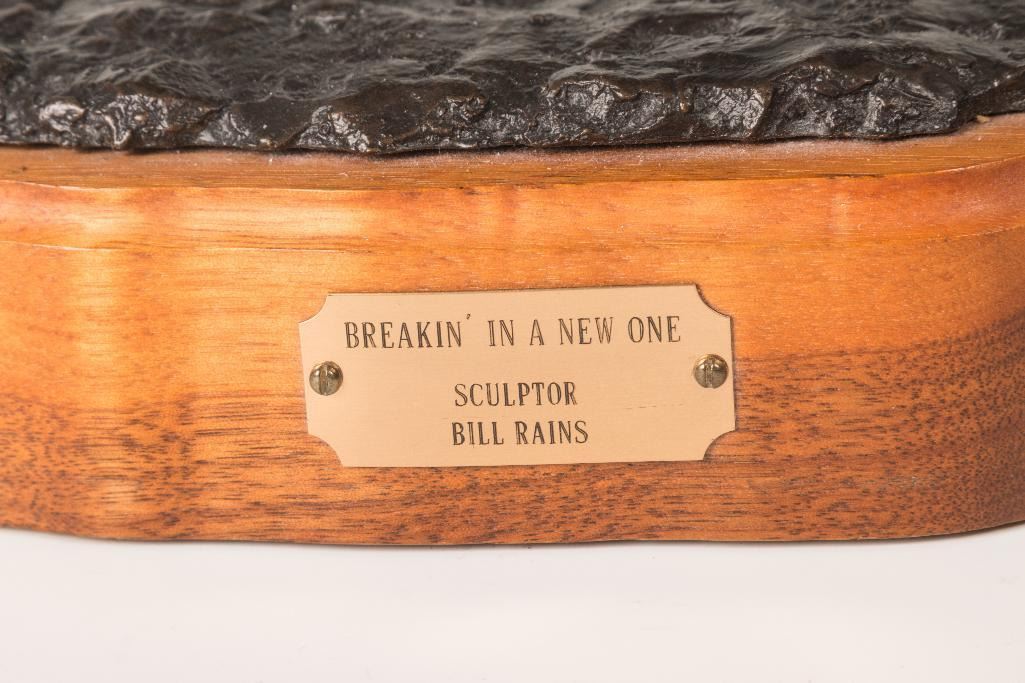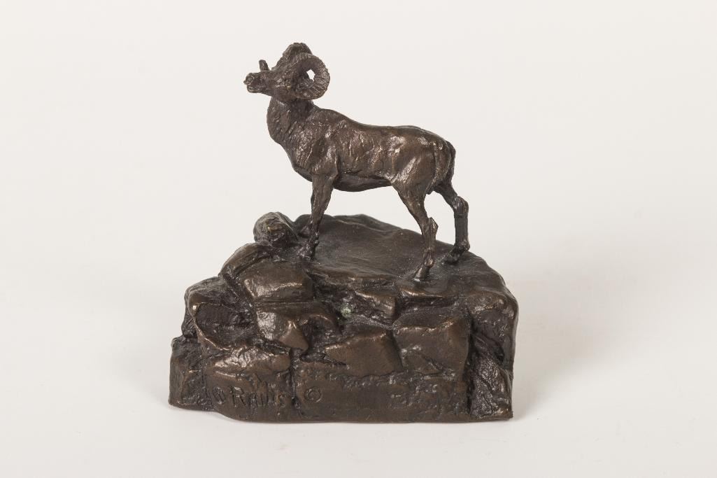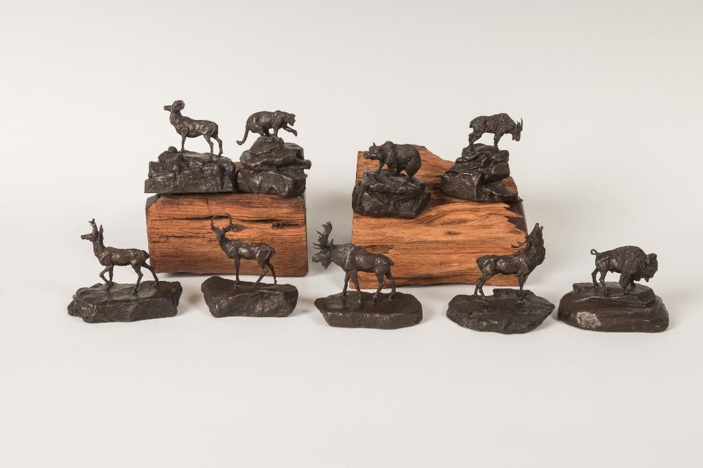 Bill Rains (20th/21st C.) 10 bronzes 1) Breakin' In A New One 11" x 12.25" x 9" Inscribed:(C) 14/15, W. Rains '74 Other nine bronzes are miniature and include a moose, sheep, bear, elk, bison, pronghorn, deer, goat and mountain lion. Largest is 2.5" x 2.5" x 1.5". All are inscribed:(C) W. Rains, 54/250. $1,000-1,500