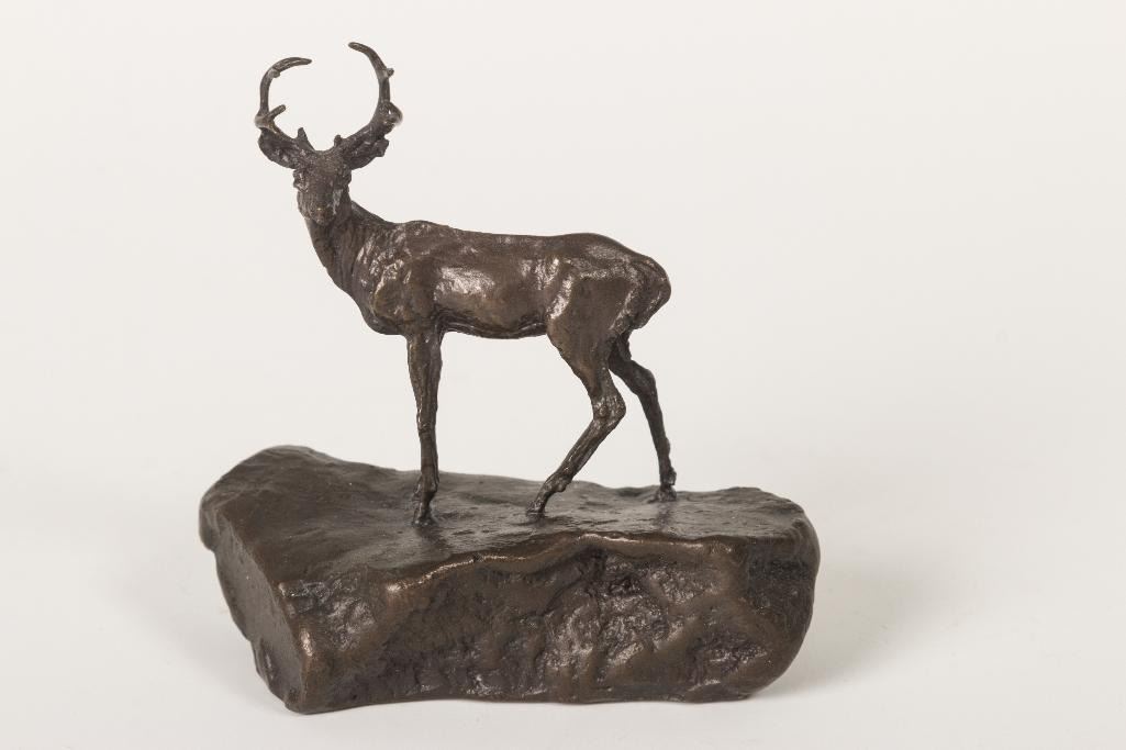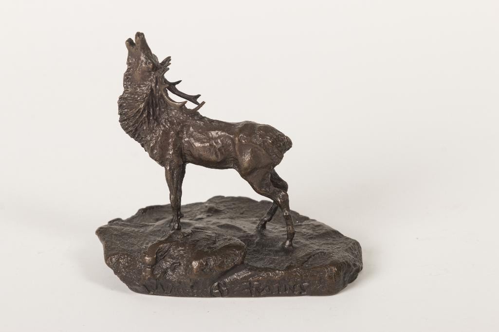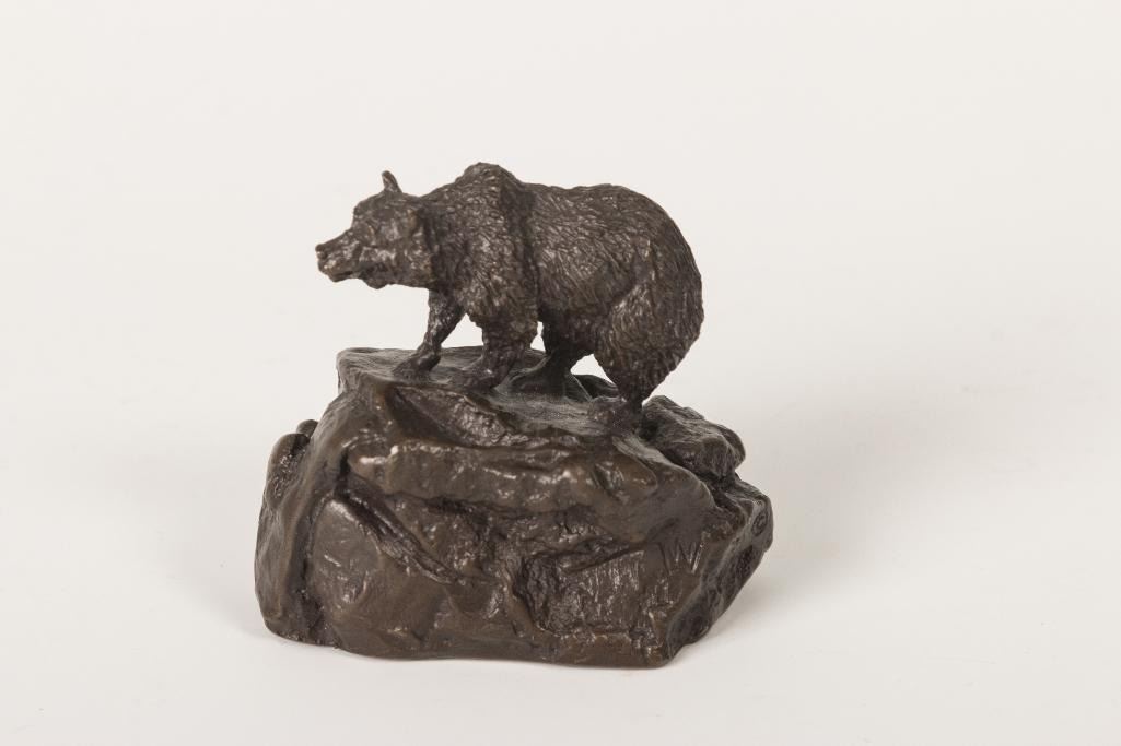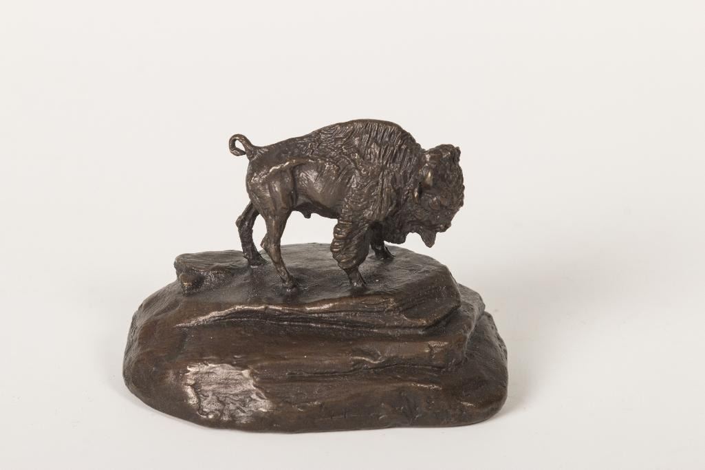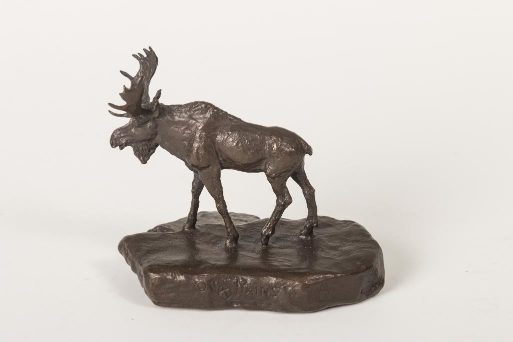 Bill Rains (20th/21st C.) 10 bronzes 1) Breakin' In A New One 11" x 12.25" x 9" Inscribed:(C) 14/15, W. Rains '74 Other nine bronzes are miniature and include a moose, sheep, bear, elk, bison, pronghorn, deer, goat and mountain lion. Largest is 2.5" x 2.5" x 1.5". All are inscribed:(C) W. Rains, 54/250. $1,000-1,500