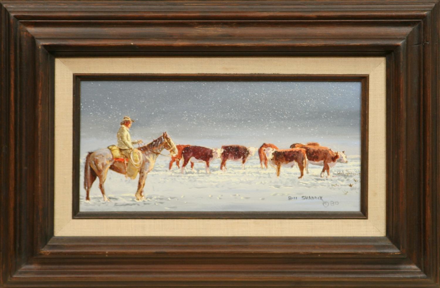 Bill Shaddix (b. 1931). Keeping Watch. 6" x 12" oil on board. signed and dated '80 lower right. titled on back. (est $700-1,000) Condition Report: Black lights clean