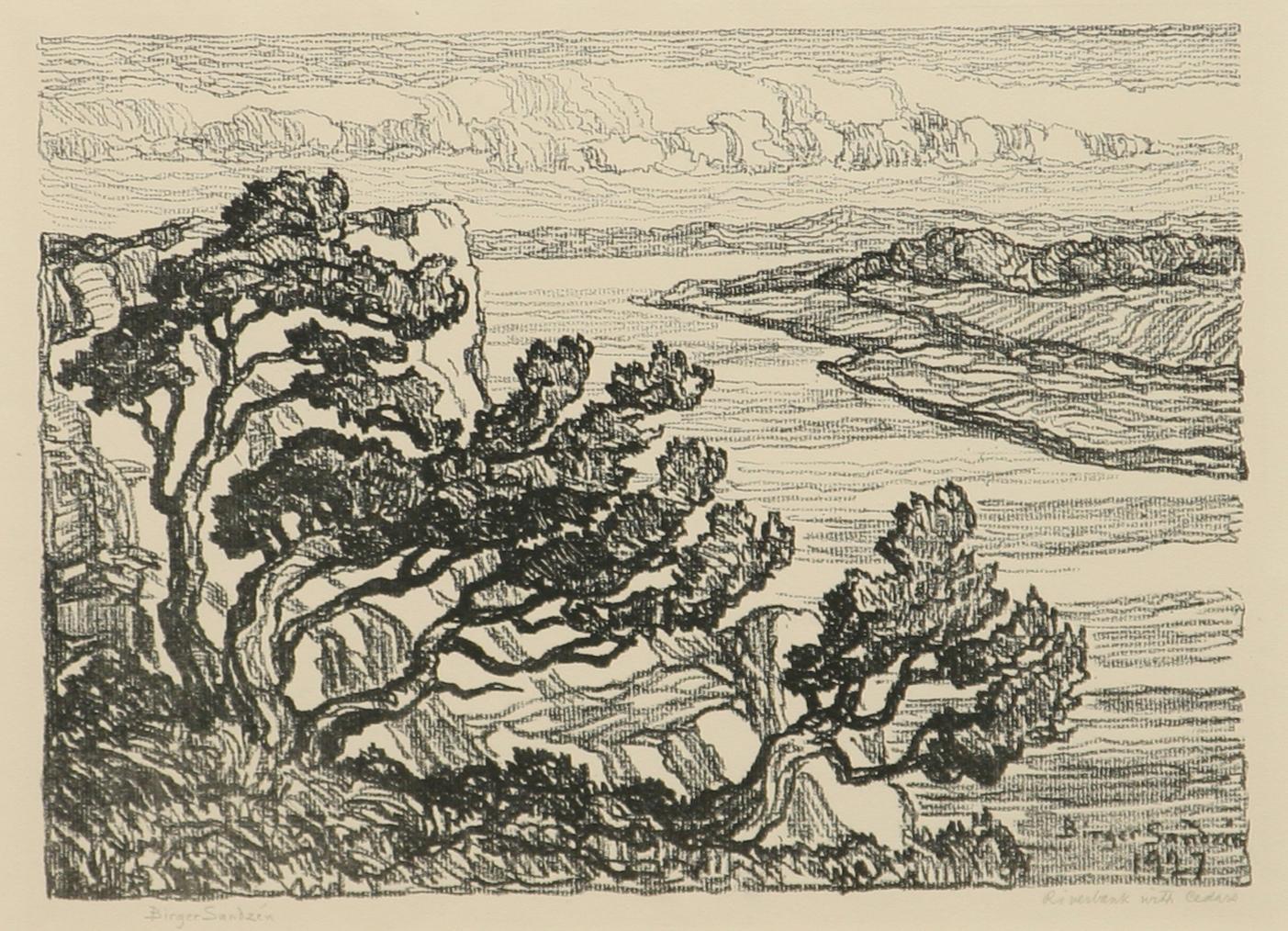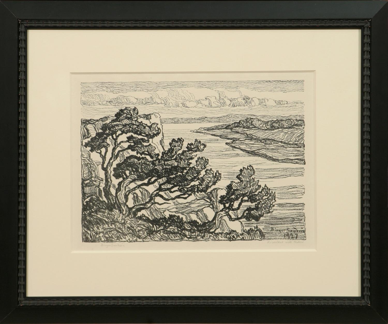 Birger Sandzen (1871-1954). Riverbank With Cedars. 10" x 14" lithograph. signed & dated 1927 in image. pencil signed in margin. (est $900-1,200) Condition Report: Clean and bright. Excellent condition