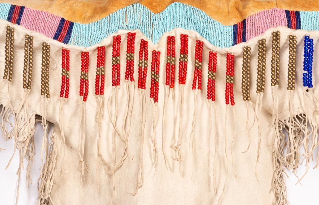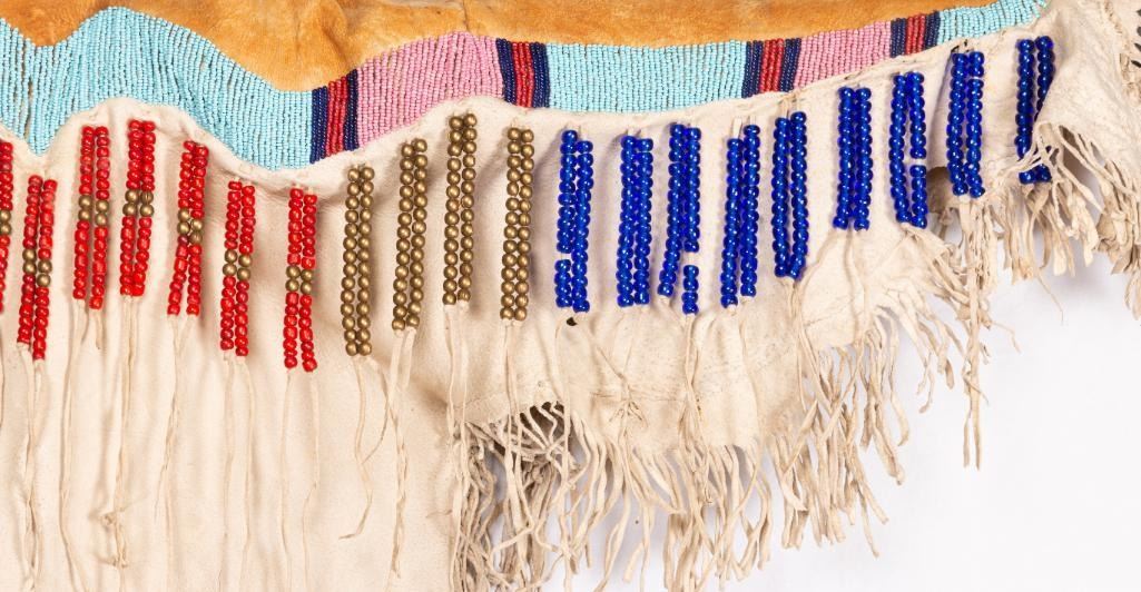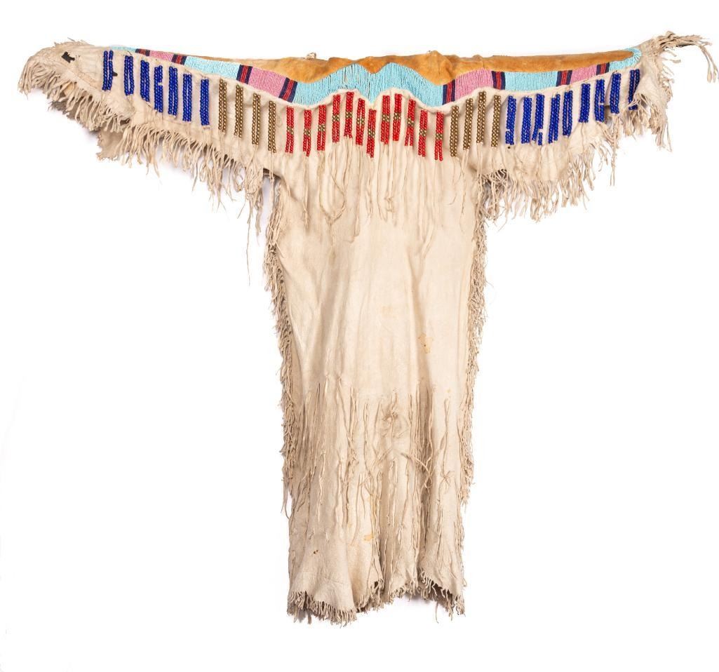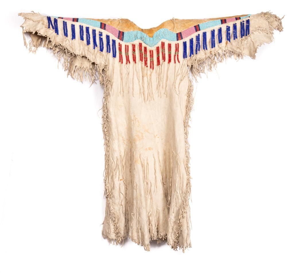Blackfeet Beaded Dress 47" wide, 41" long. Accented with trade beaded 7" fringe. Circa 1890. $5,000-7,000