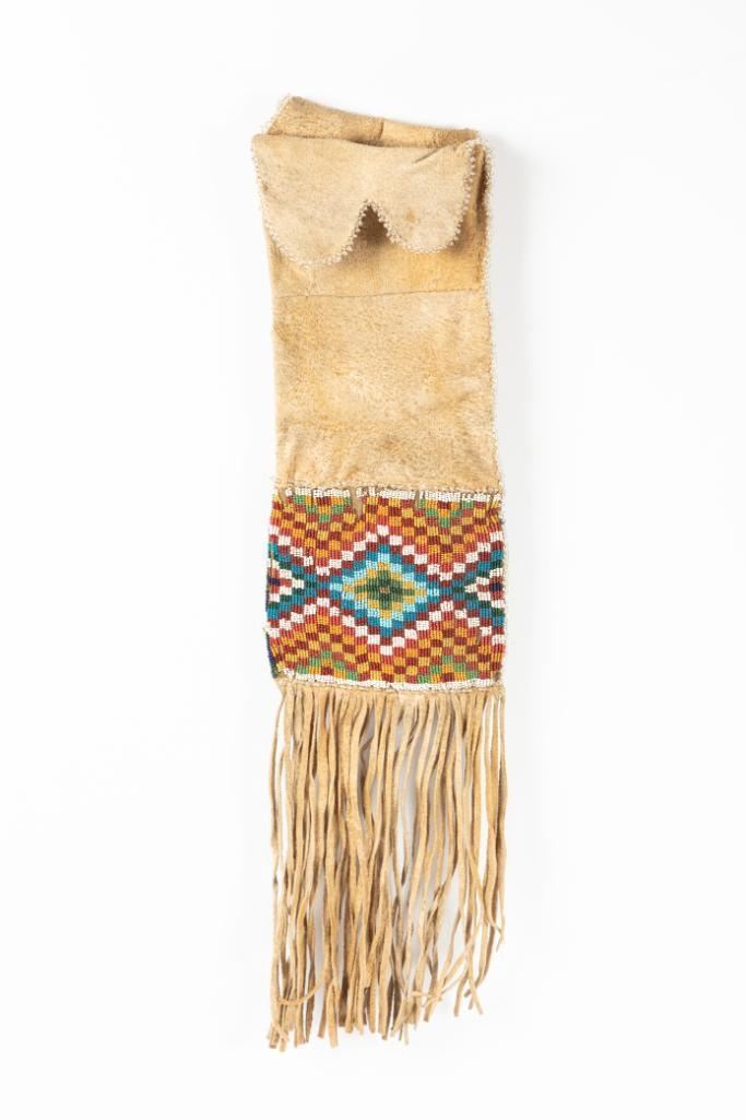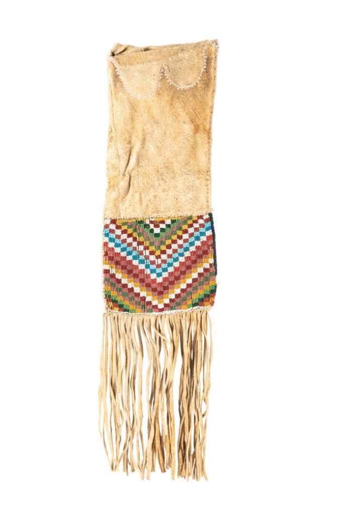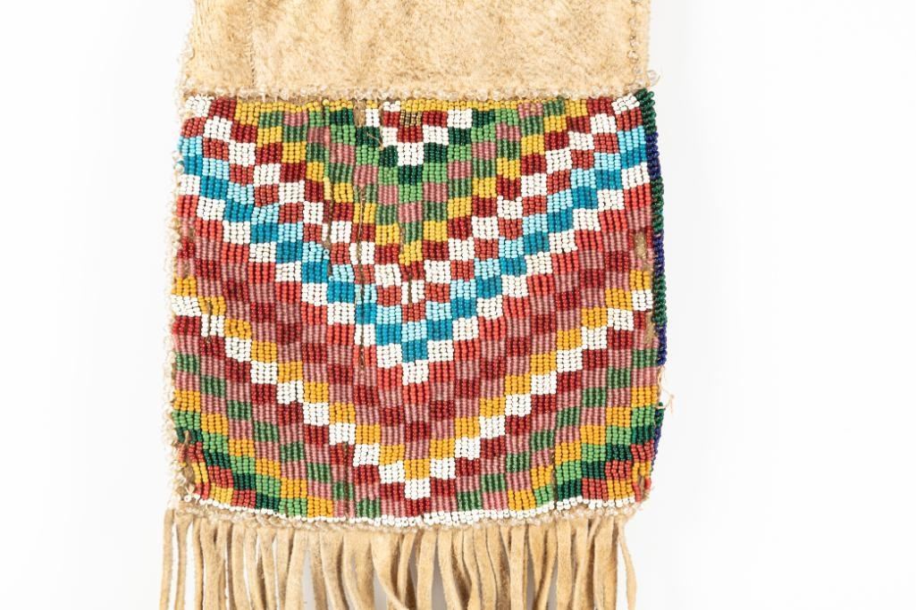 23" long overall including 9" of fringe. Checkered beaded designs and a scalloped top. Early 20th century.