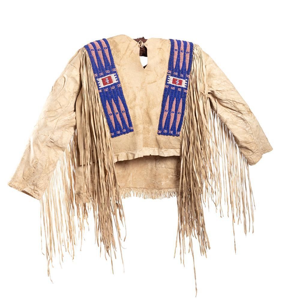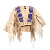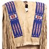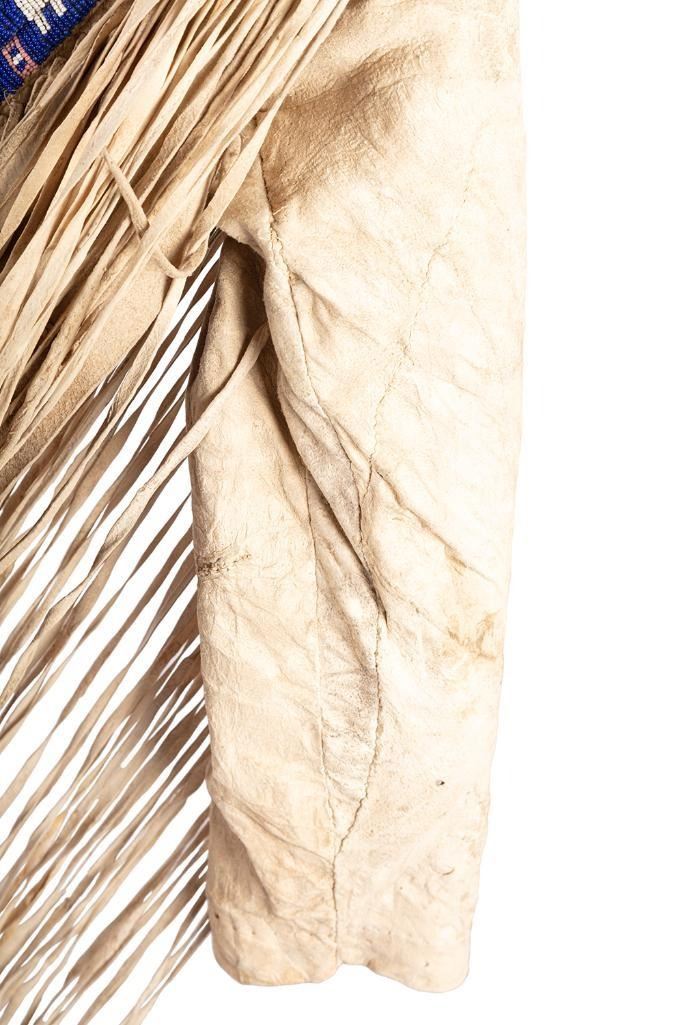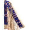 25" long with an additional 12" of hanging fringe. 55" cuff to cuff. Beautiful beaded strips in striking blue and pink designs. Late 1800s.