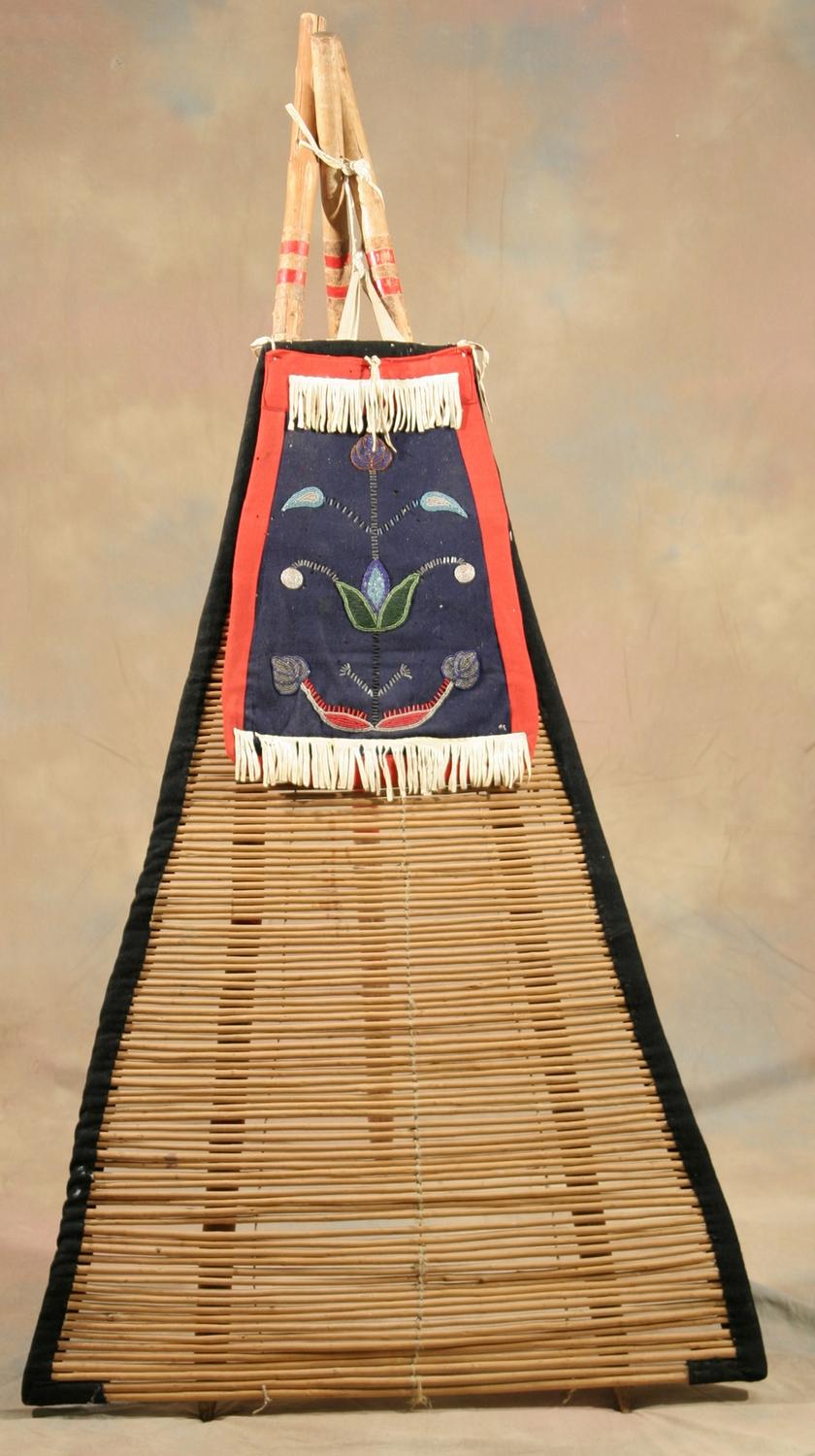 Blackfoot Teepee Backrest with Original Poles. 65" tall (to top of poles), 36" (bottom), 10" (top). Early 20th century. (est $2,000-3,000) Condition Report: Willows in excellent condition with some minor staining from use. Cloth with beadwork fine with a few minor moth holes. Painted poles are in fine condition