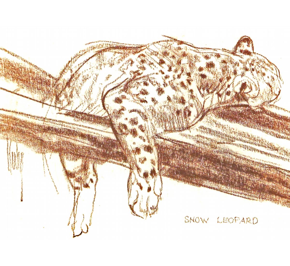 Bob F. Kuhn (1920 - 2007). Snow Leopard. 7.5" x 10" conte crayon. Signed lower left: Kuhn. Titled lower right.
