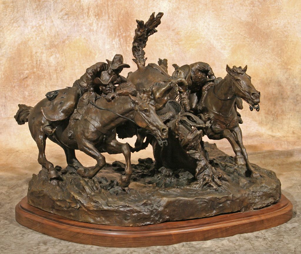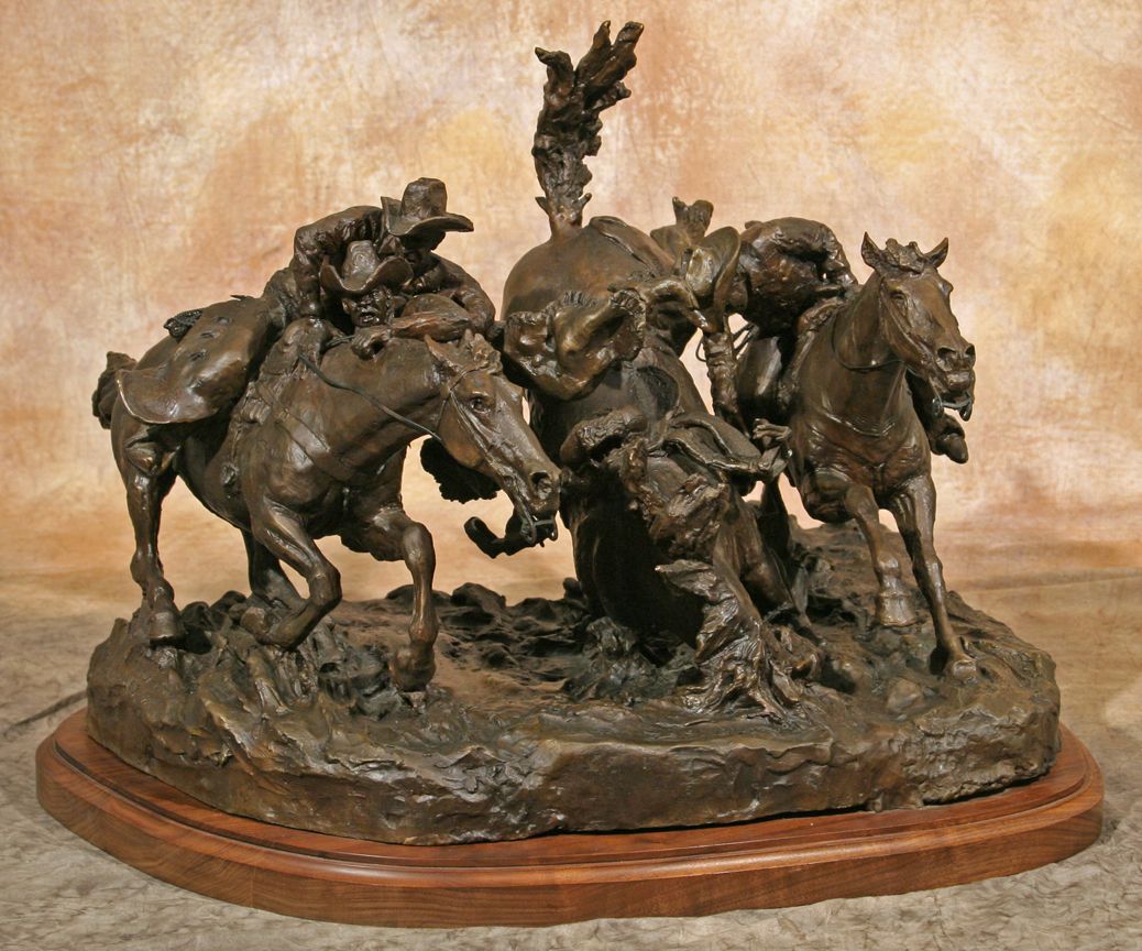 Bob Scriver (1914 - 1999) CA. Not For Glory. From the Rodeo Series. 21" x 24" x 26" bronze. Inscribed: -2- © BOB SCRIVER 1971. Bighorn Foundry. Original certificate included. Provenance: Ex- Archie Miller collection, Collection of Dr. Delwin & Karen Bokelman, PA & pictured in their book Precious Dreams, page 58. Internet, absentee & telephone, absentee & telephone bidders please be advised that this bronze is of substantial weight. Please call March in Montana an estimate prior to bidding - (307) 635-0019. Condition reports can be viewed at www.marchinmontana.com/docs/2013CR.pdf