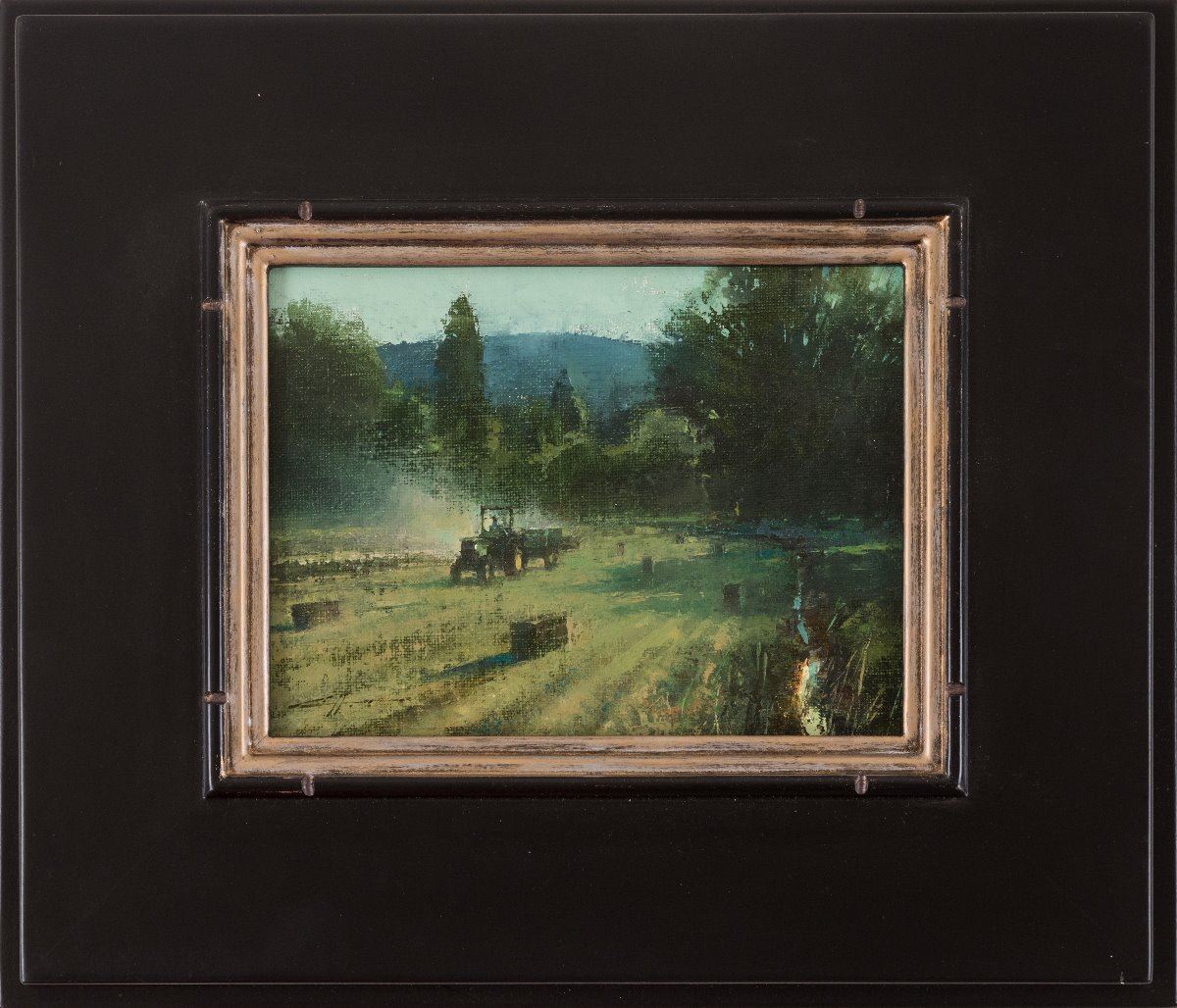 Brent Cotton (1972 - ). Bailing Hay. 6" x 8" oil on board. Signed lower left. Verso: Titled, signed and dated 2015.