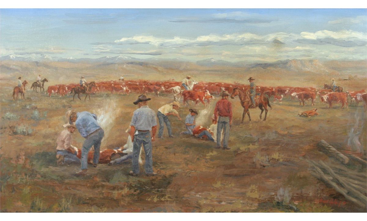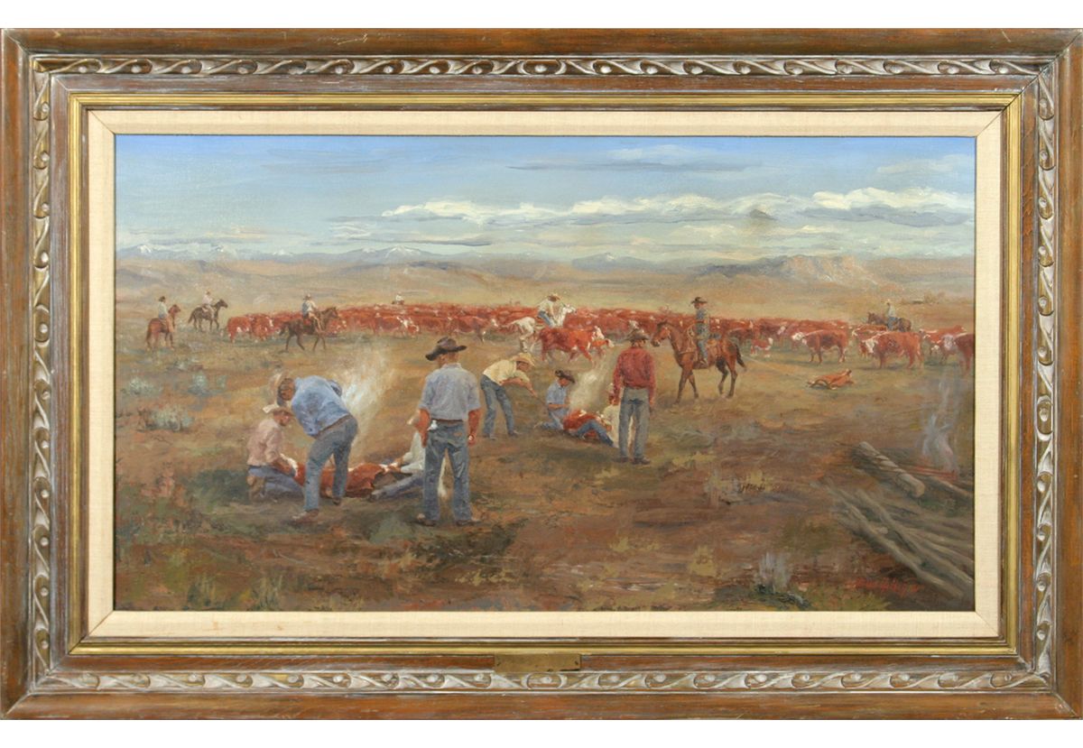 Bud Helbig (1919 - 2002) CA. Branding Time - Montana. 20" x 36" oil on canvas. Signed lower right: Bud Helbig 71. Condition reports can be viewed at www.marchinmontana.com/docs/2013CR.pdf