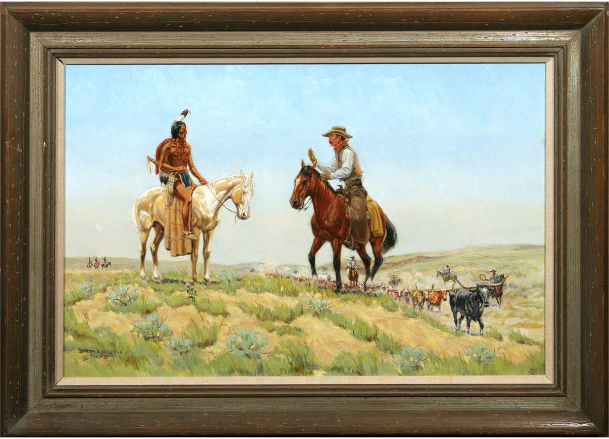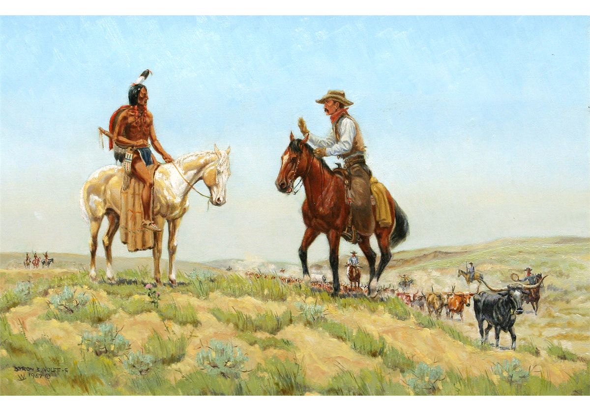 Byron Wolfe (1904 - 1973) CA. On The Chisolm Trail. 20" x 30" oil on canvas. Signed lower left: BYRON B. WOLFE- CA [cypher] 1969 ©. Multiple exhibition labels verso: Colorado State University (1973), The Museum at Texas Tech University (1976), Phippen Museum of Western Art (1994), Harmsen Museum of Art & the Colorado Historical Society. Alternate title: Parley For The Wohaws.