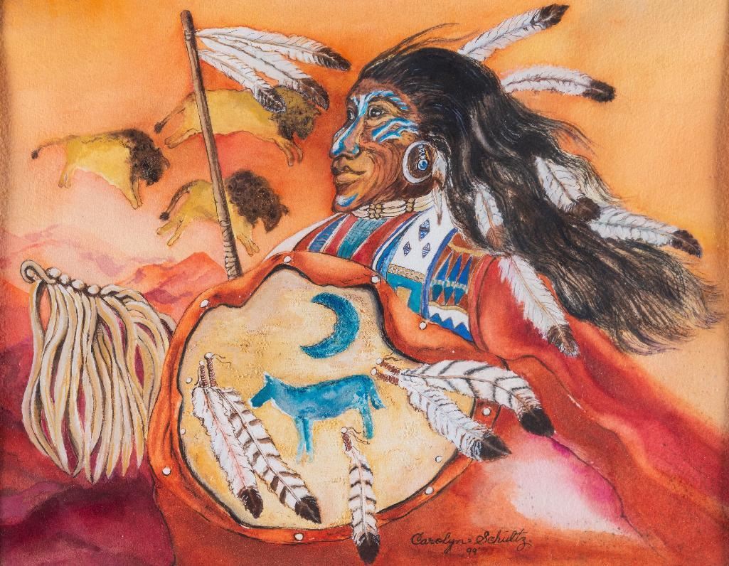 Three Works: 1) Carolyn Schultz (20th C.) Spirit of the Buffalo 10.5" 13.5" watercolor Signed and dated '99 lower right center 2) Nancy McLaughlin (1932-1985) Mother and Child 20" x 13" pastel Signed and dated 1966 lower right 3) Sharon Sharpe Ghost Riders 3.25" x 3.25" watercolor Signed lower left center $1,000-1,500