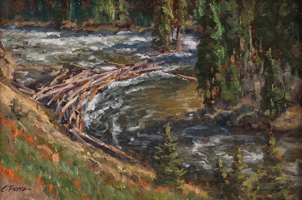 Charles Fritz (1955 - ). Log Jam on Rock Creek. 10" x 15" oil on board. Signed lower left.