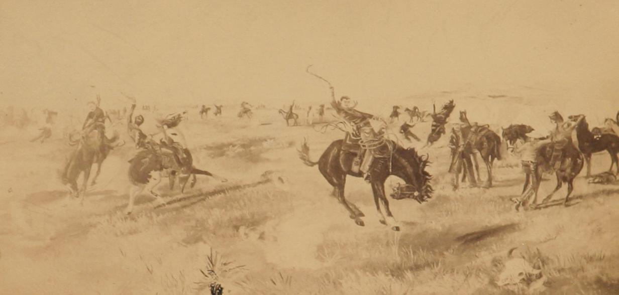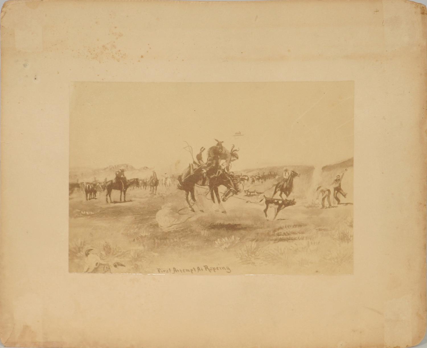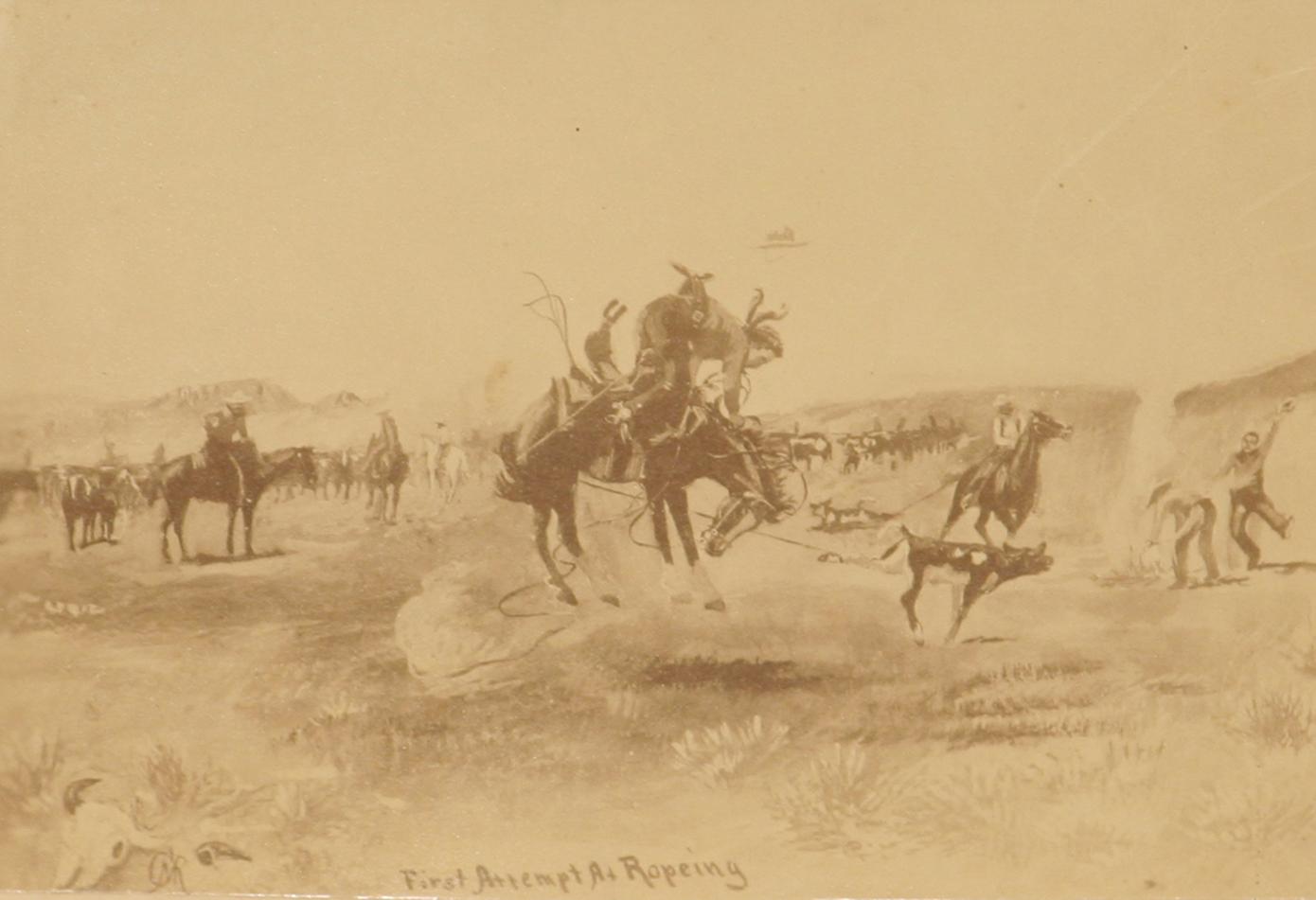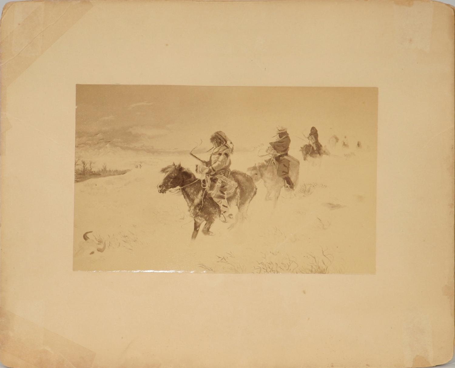 Charles M. Russell (1864-1926). 3 vintage photographs of Russell's works. (1) 5" x 5". (2) 5 ½" x 8". (3) 4 ¼" x 8 ¾". (est $600-800) Condition Report: Images clear, but all are discolored from age